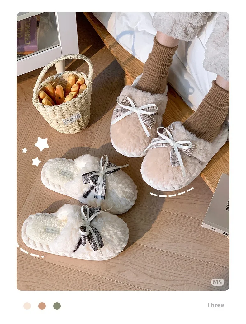 Autumn And Winter New Bow Tie Cotton Slippers Ladies Outside The Girl Heart Warm Plush Indoor Home Monthly Shoes Cotton Slippers
