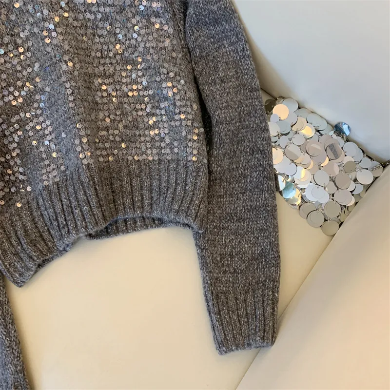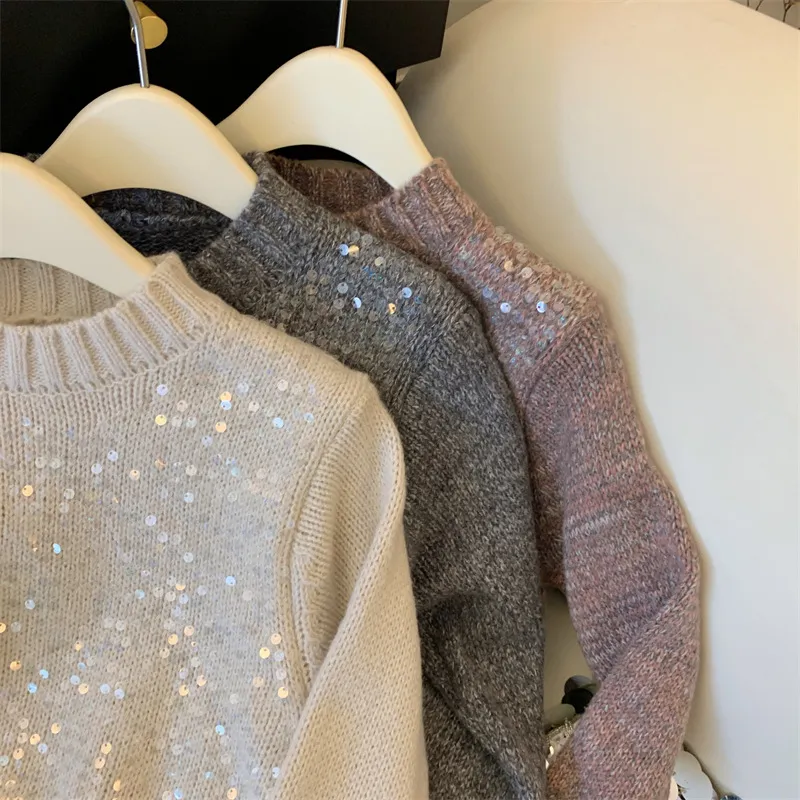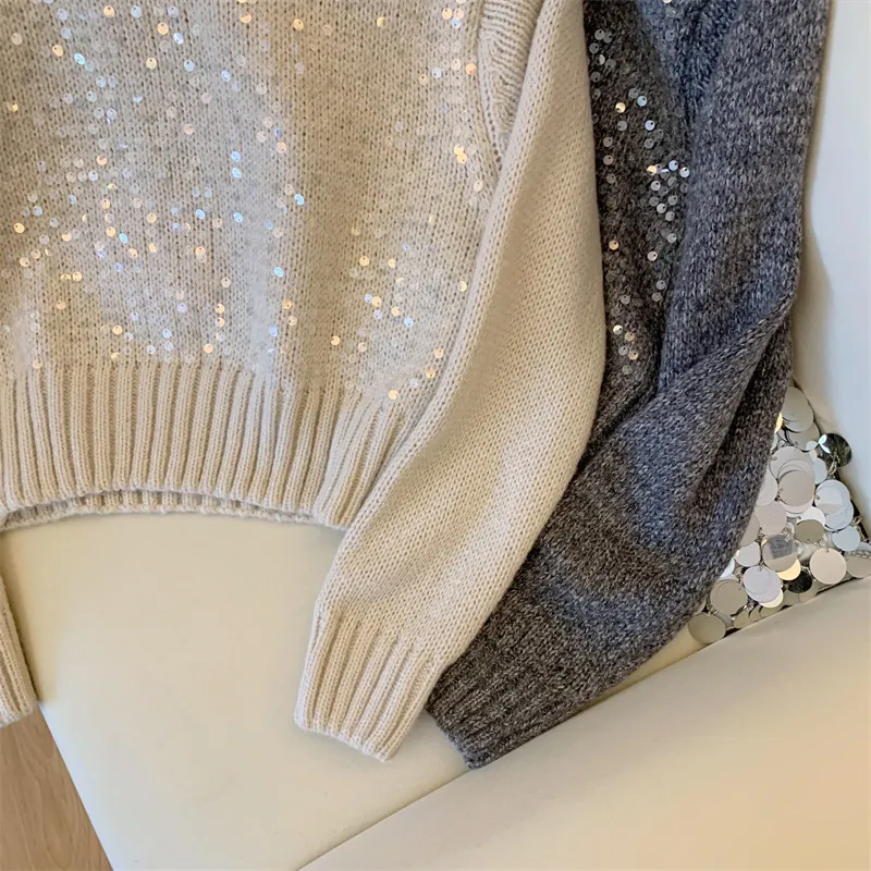 Autumn And Winter New Round Neck Heavy Embroidery Sequins Knitwear Top For Women