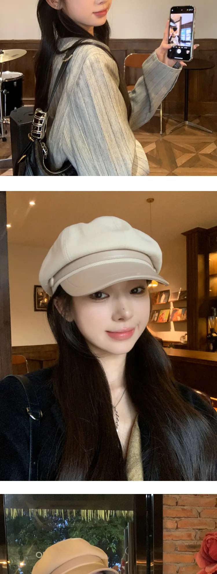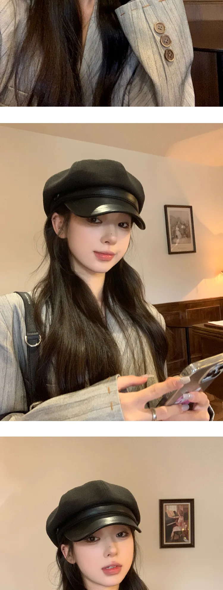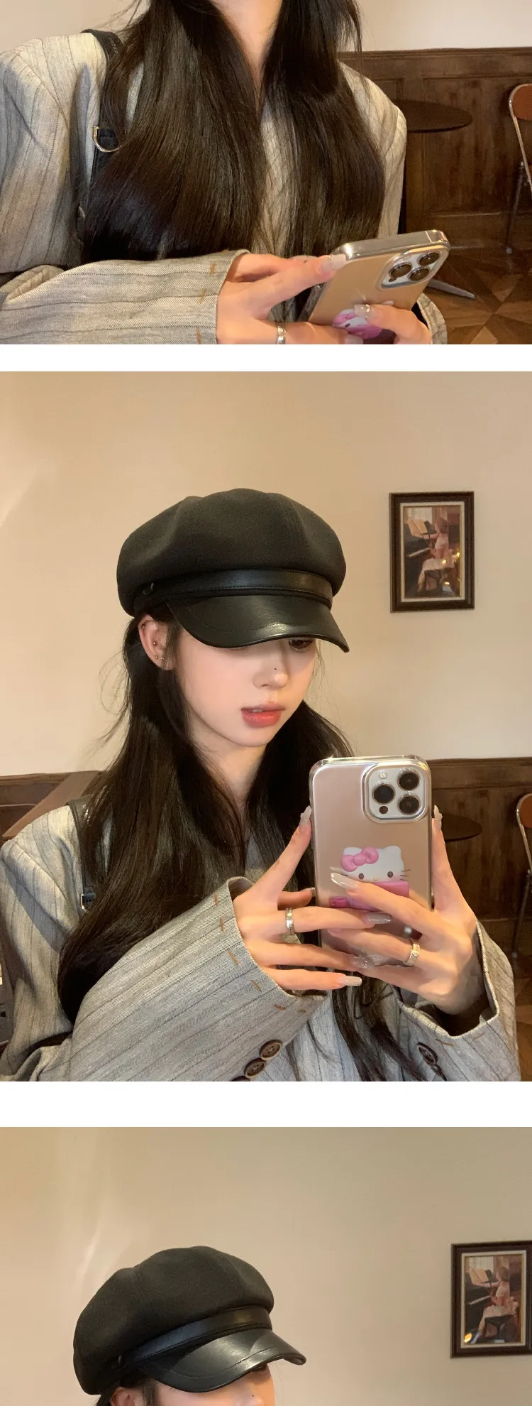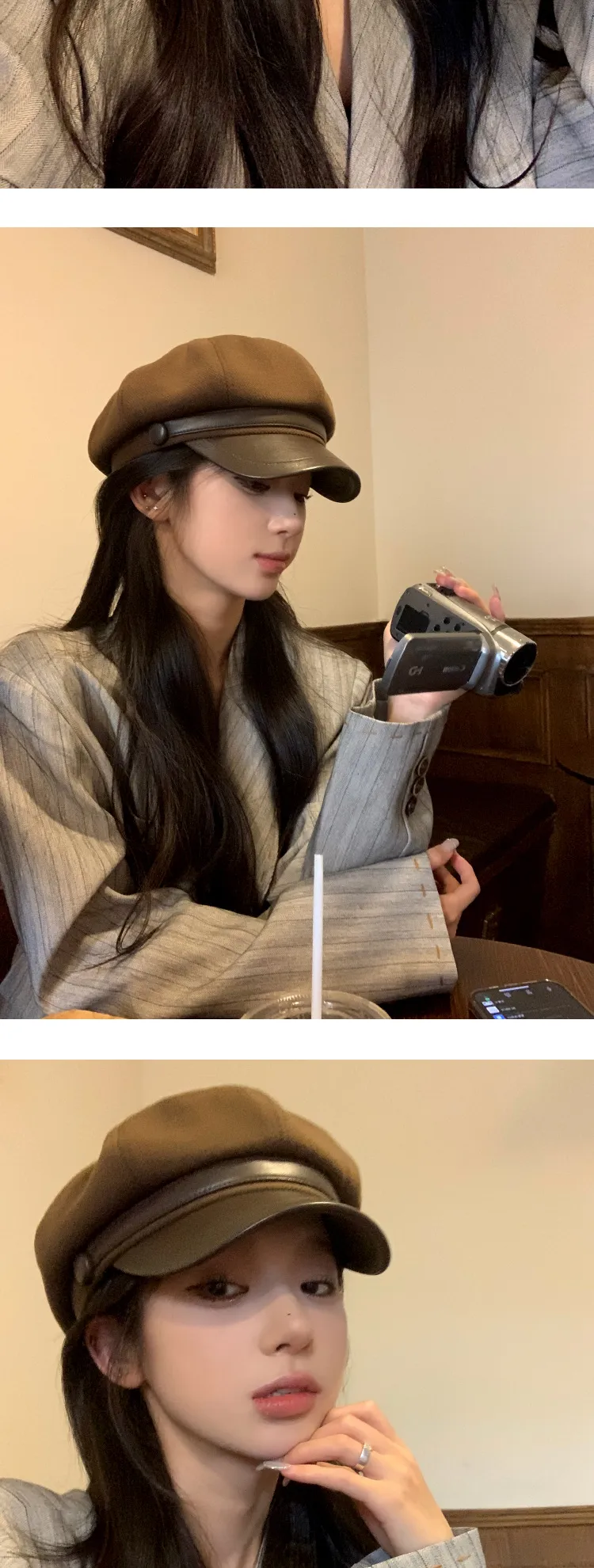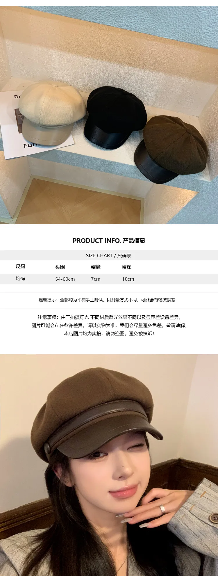 Color: Button leather brim octagonal cap-black, button leather brim octagonal cap-coffee, button leather brim octagonal cap-cream-white
