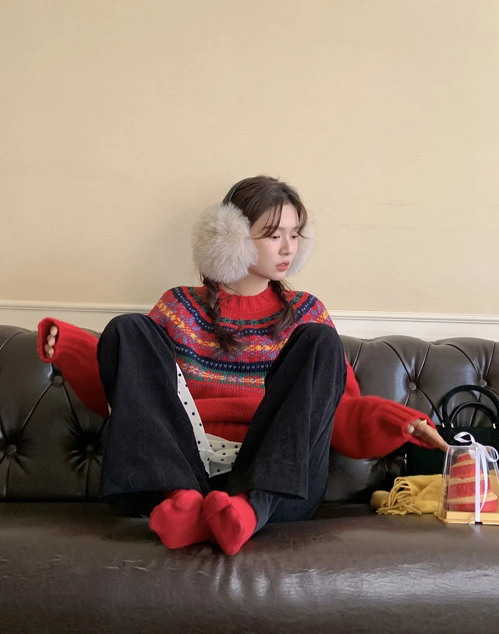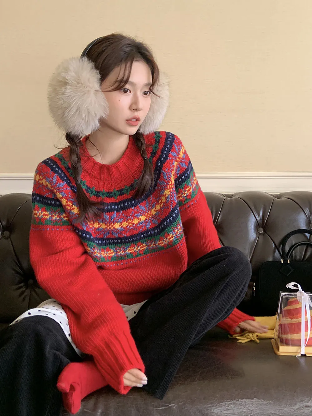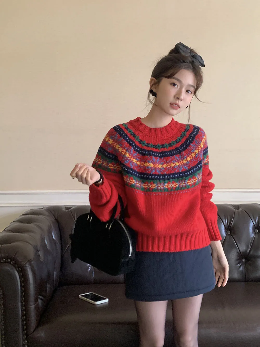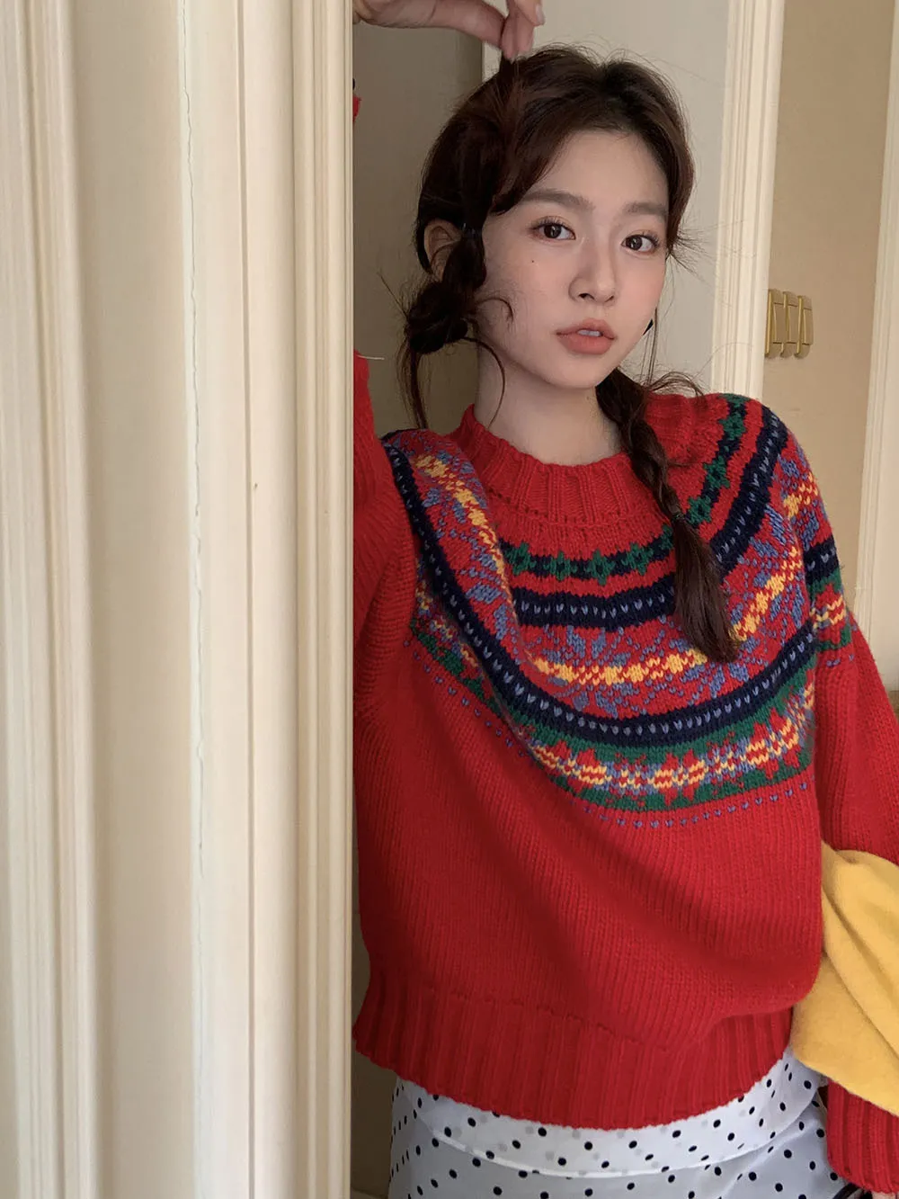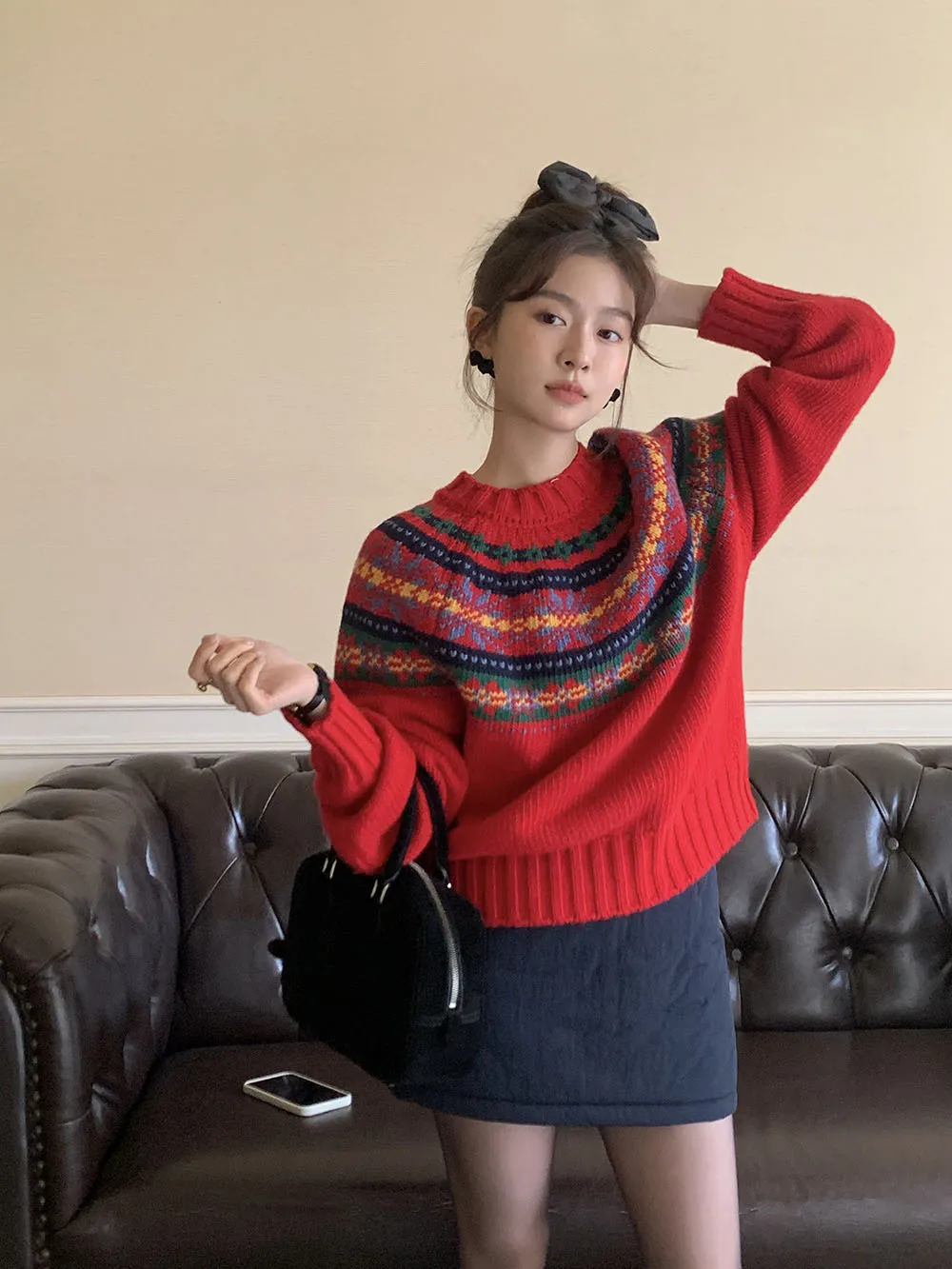 The sweater features a colorful jacquard pattern, inspired by retro holiday aesthetics. The intricate weaving adds a textured, festive look, perfect for creating a cheerful and vibrant outfit during the Christmas season. The mix of colors captures the essence of winter celebrations and brings a playful, cozy vibe to your wardrobe.