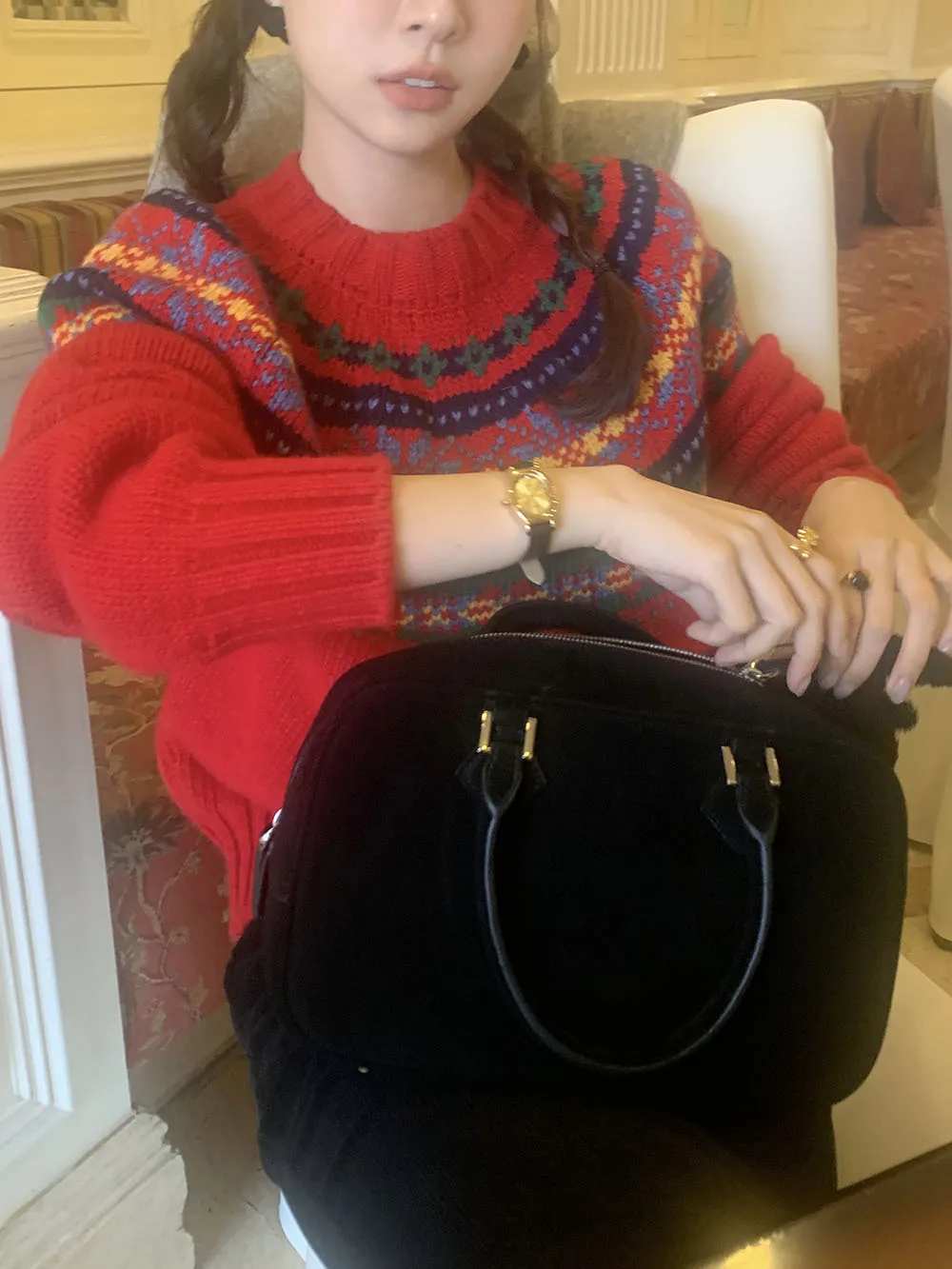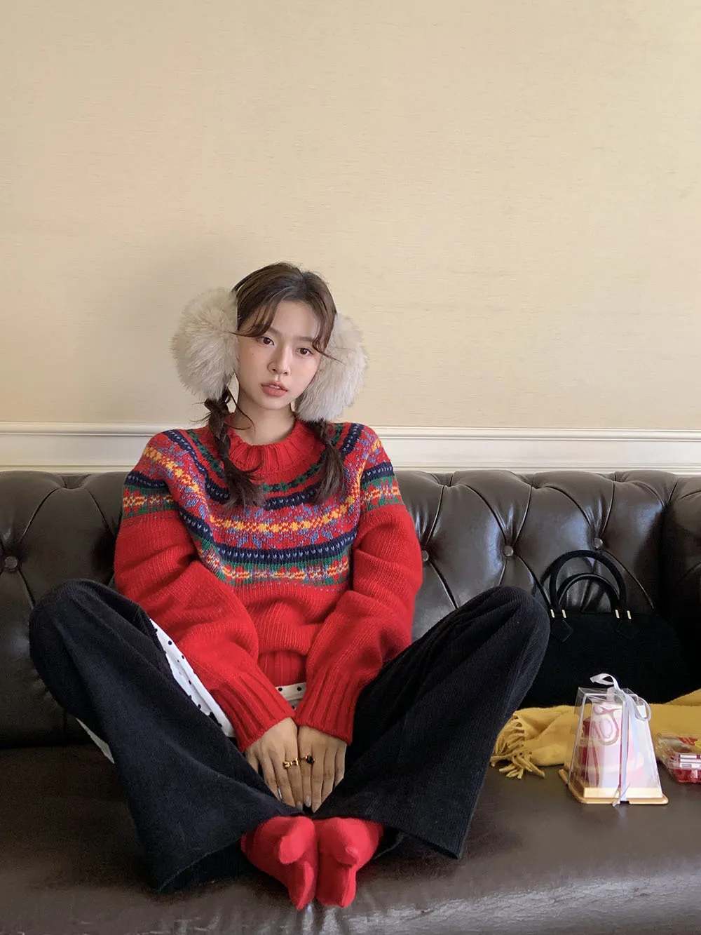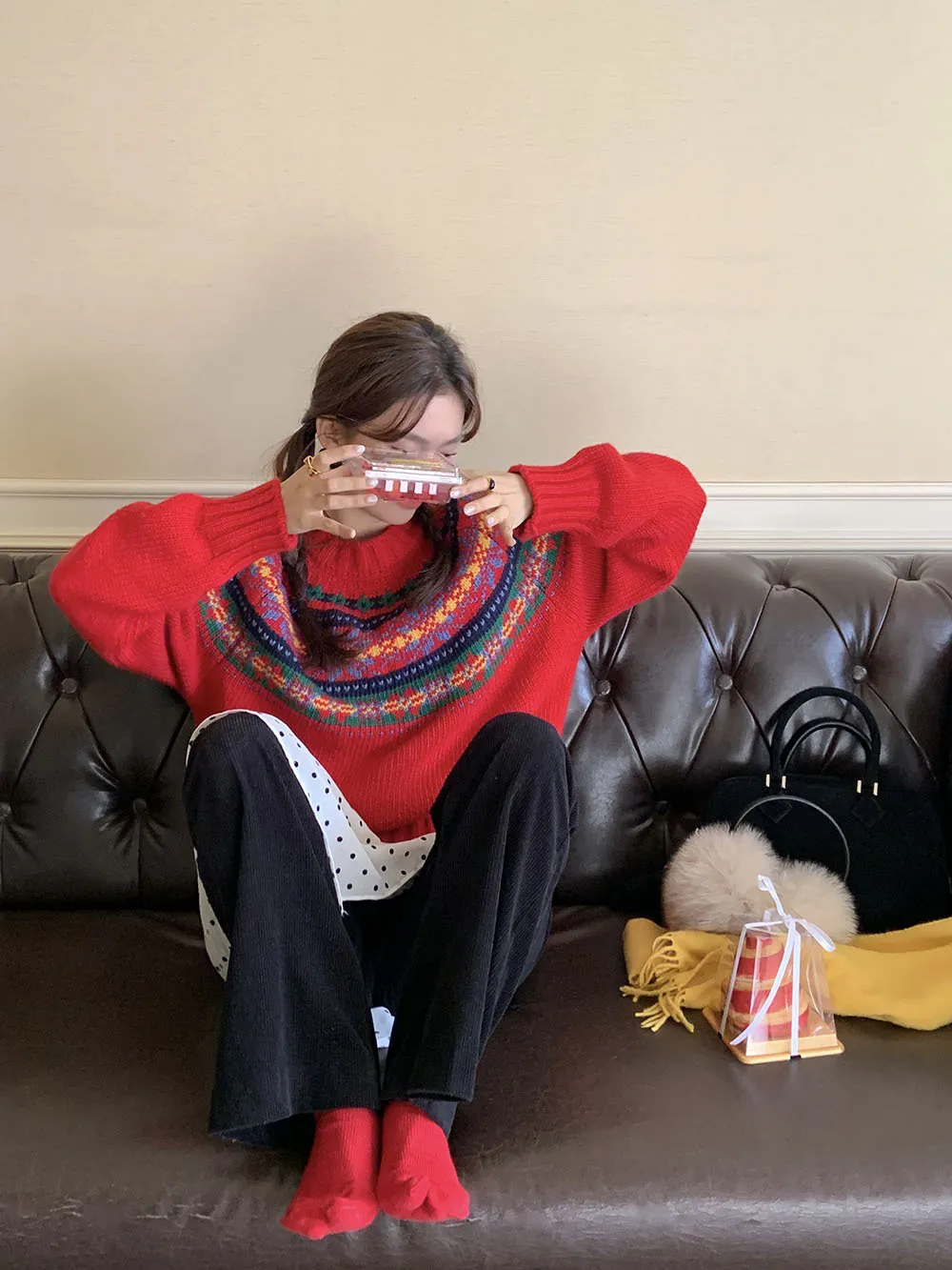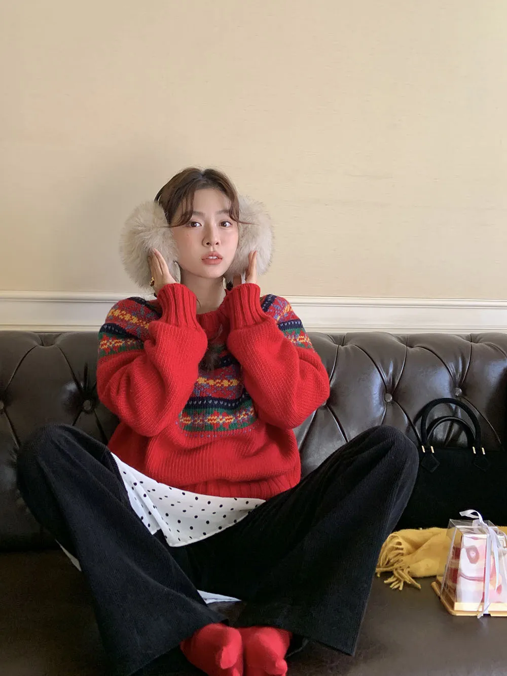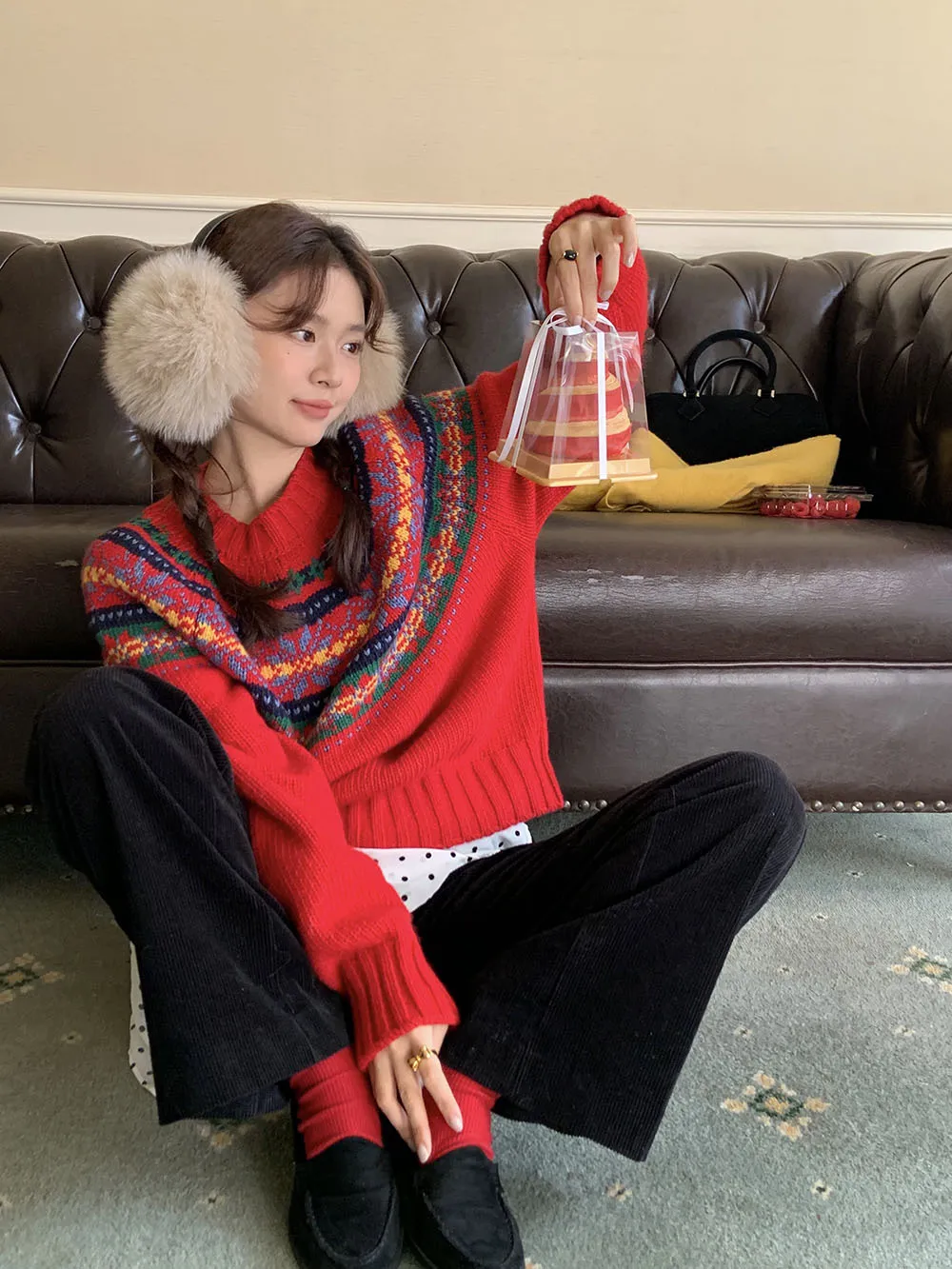 The sweater features a colorful jacquard pattern, inspired by retro holiday aesthetics. The intricate weaving adds a textured, festive look, perfect for creating a cheerful and vibrant outfit during the Christmas season. The mix of colors captures the essence of winter celebrations and brings a playful, cozy vibe to your wardrobe.