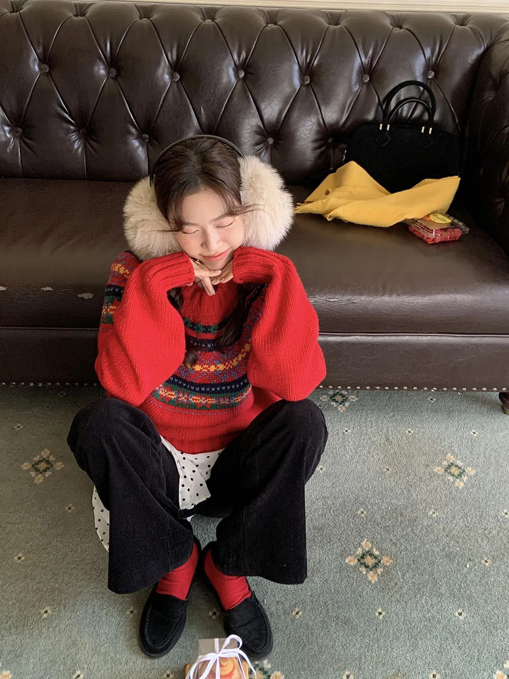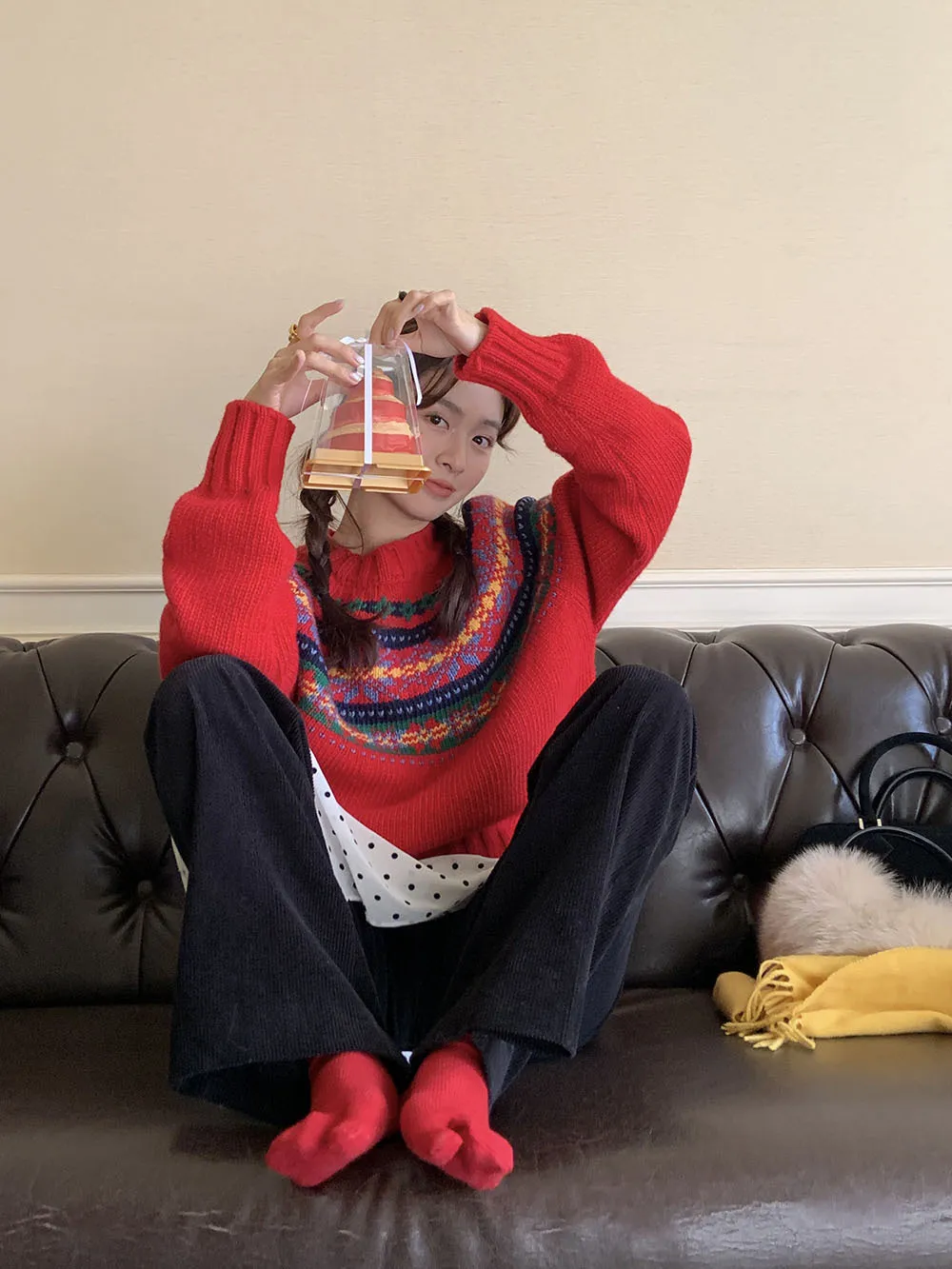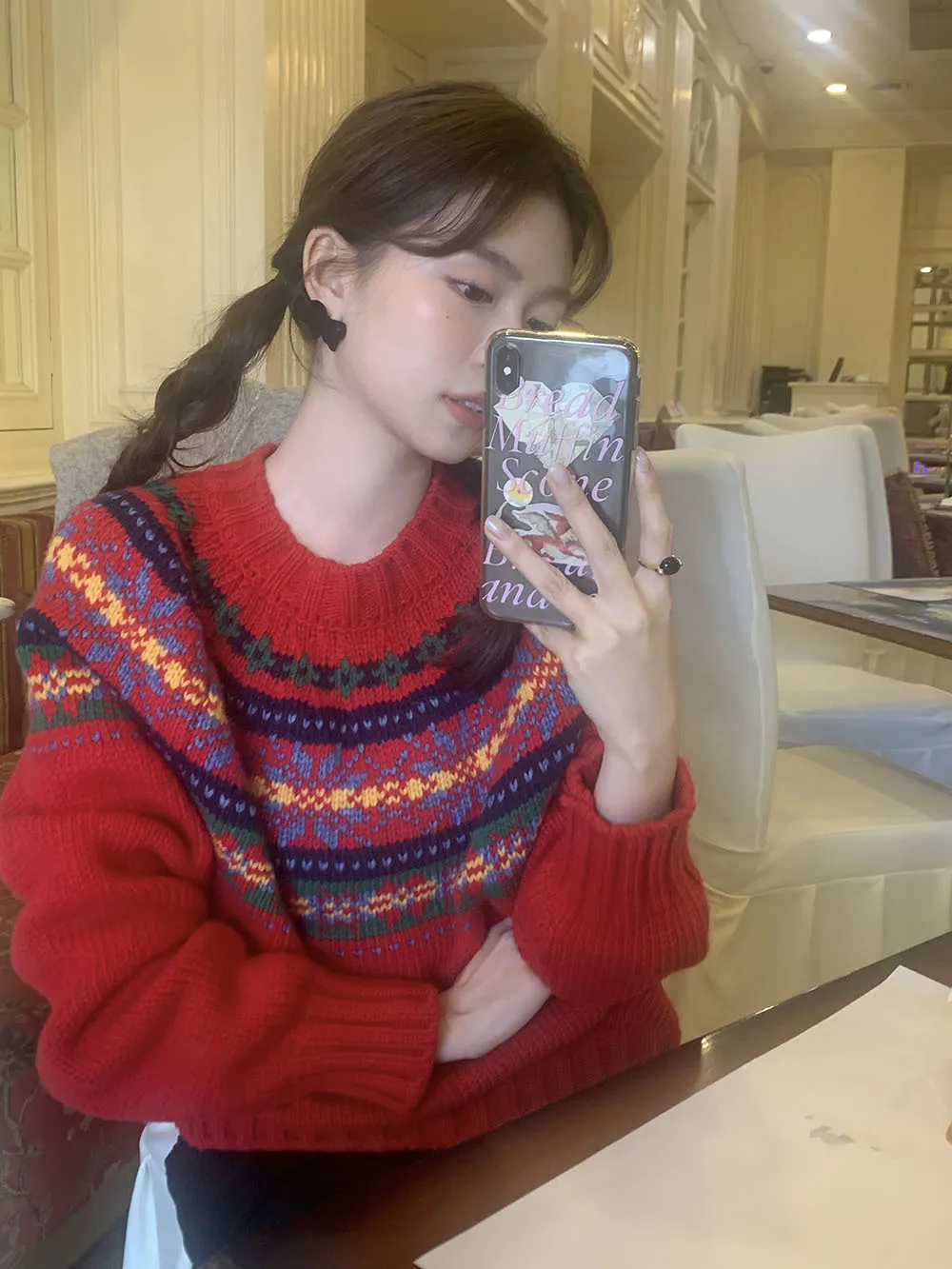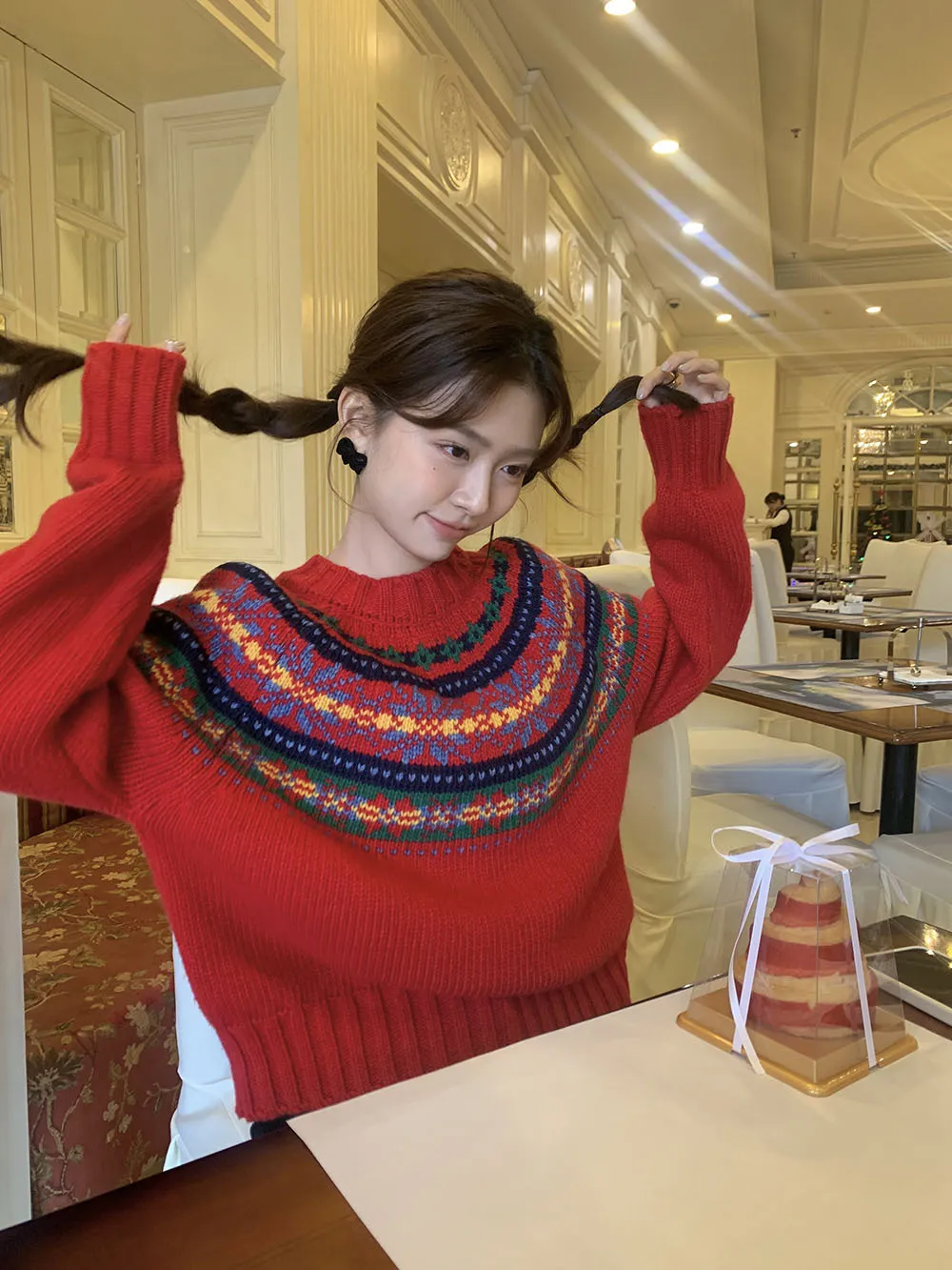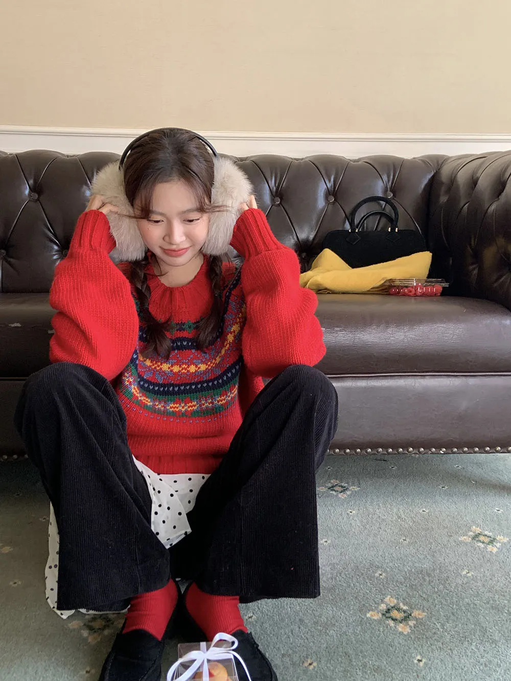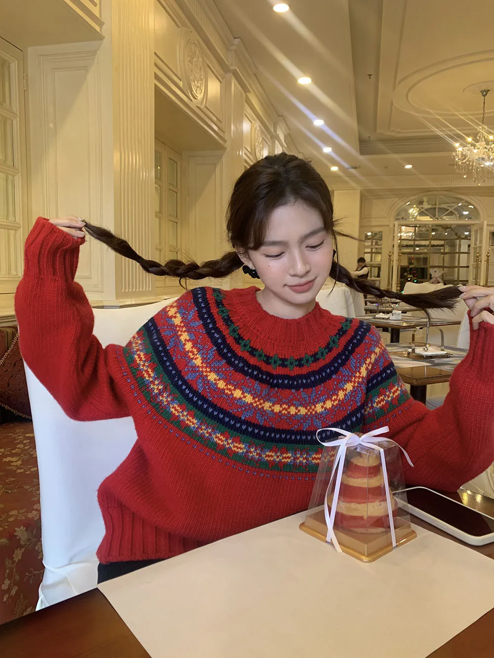 The sweater features a colorful jacquard pattern, inspired by retro holiday aesthetics. The intricate weaving adds a textured, festive look, perfect for creating a cheerful and vibrant outfit during the Christmas season. The mix of colors captures the essence of winter celebrations and brings a playful, cozy vibe to your wardrobe.
