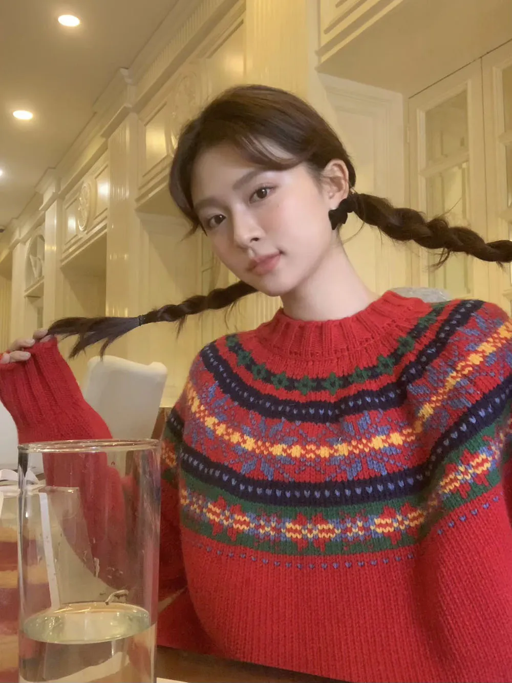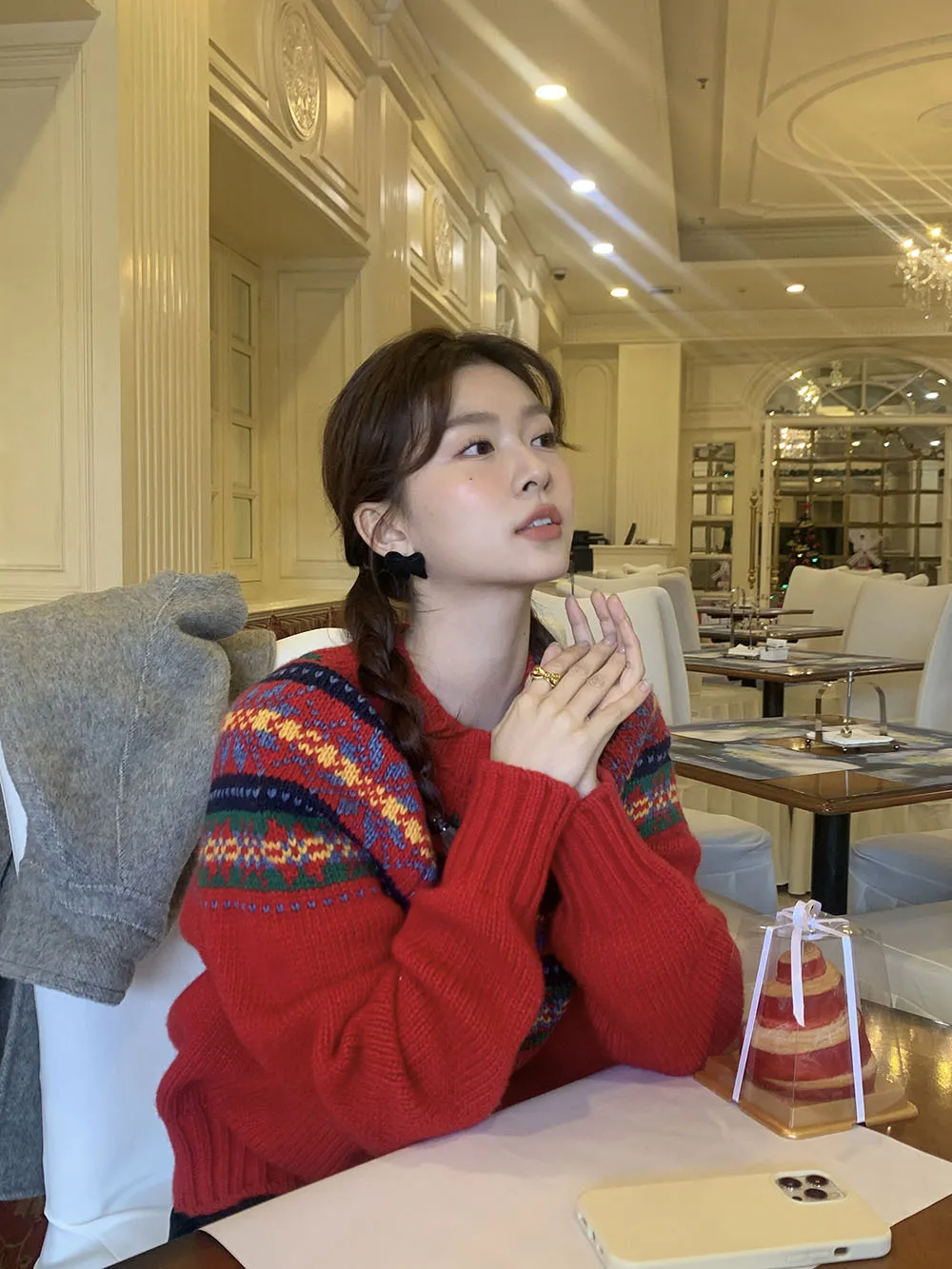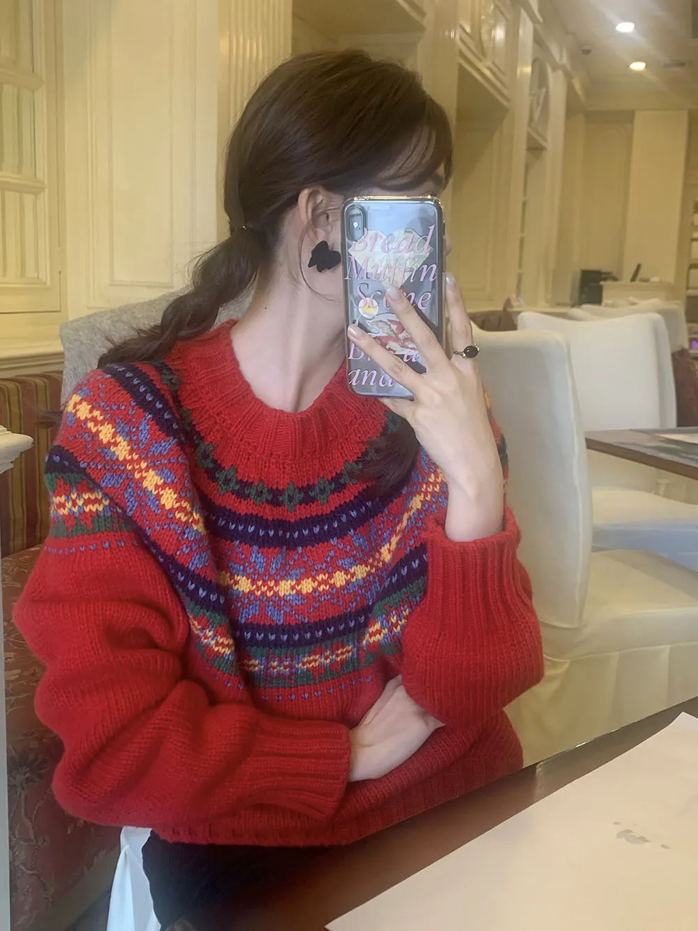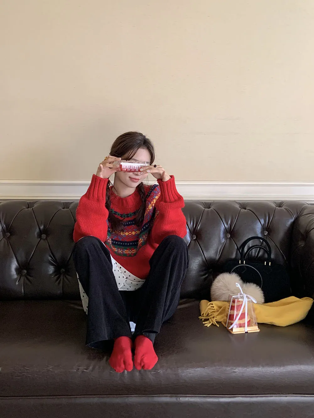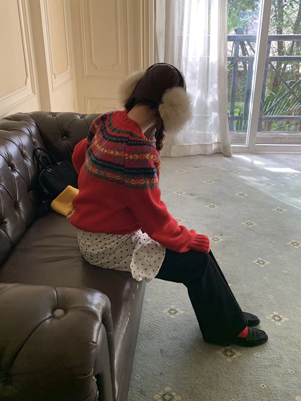 The sweater features a colorful jacquard pattern, inspired by retro holiday aesthetics. The intricate weaving adds a textured, festive look, perfect for creating a cheerful and vibrant outfit during the Christmas season. The mix of colors captures the essence of winter celebrations and brings a playful, cozy vibe to your wardrobe.