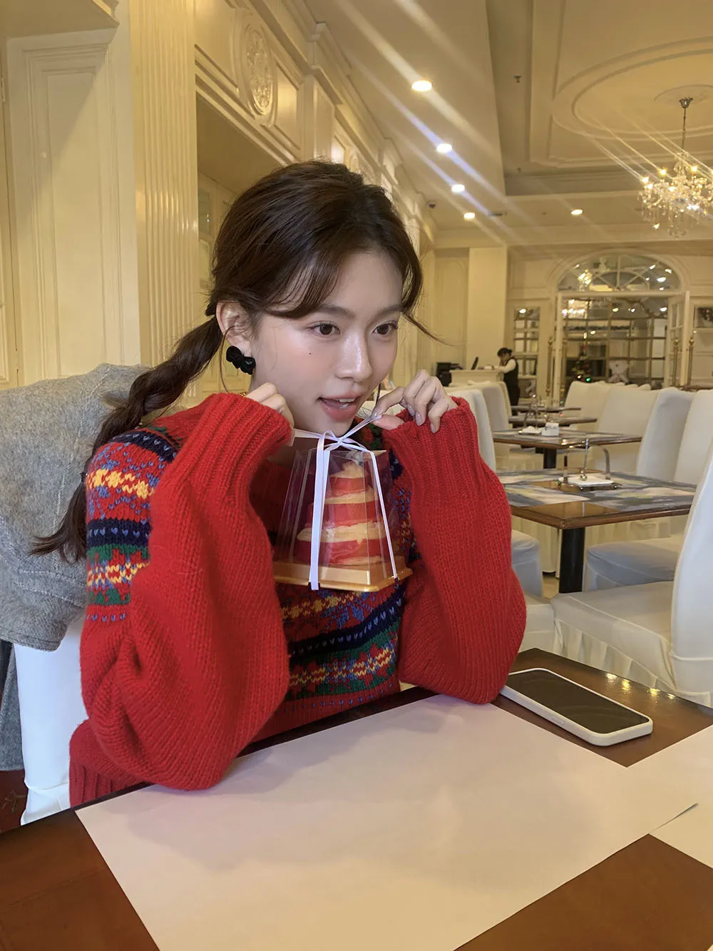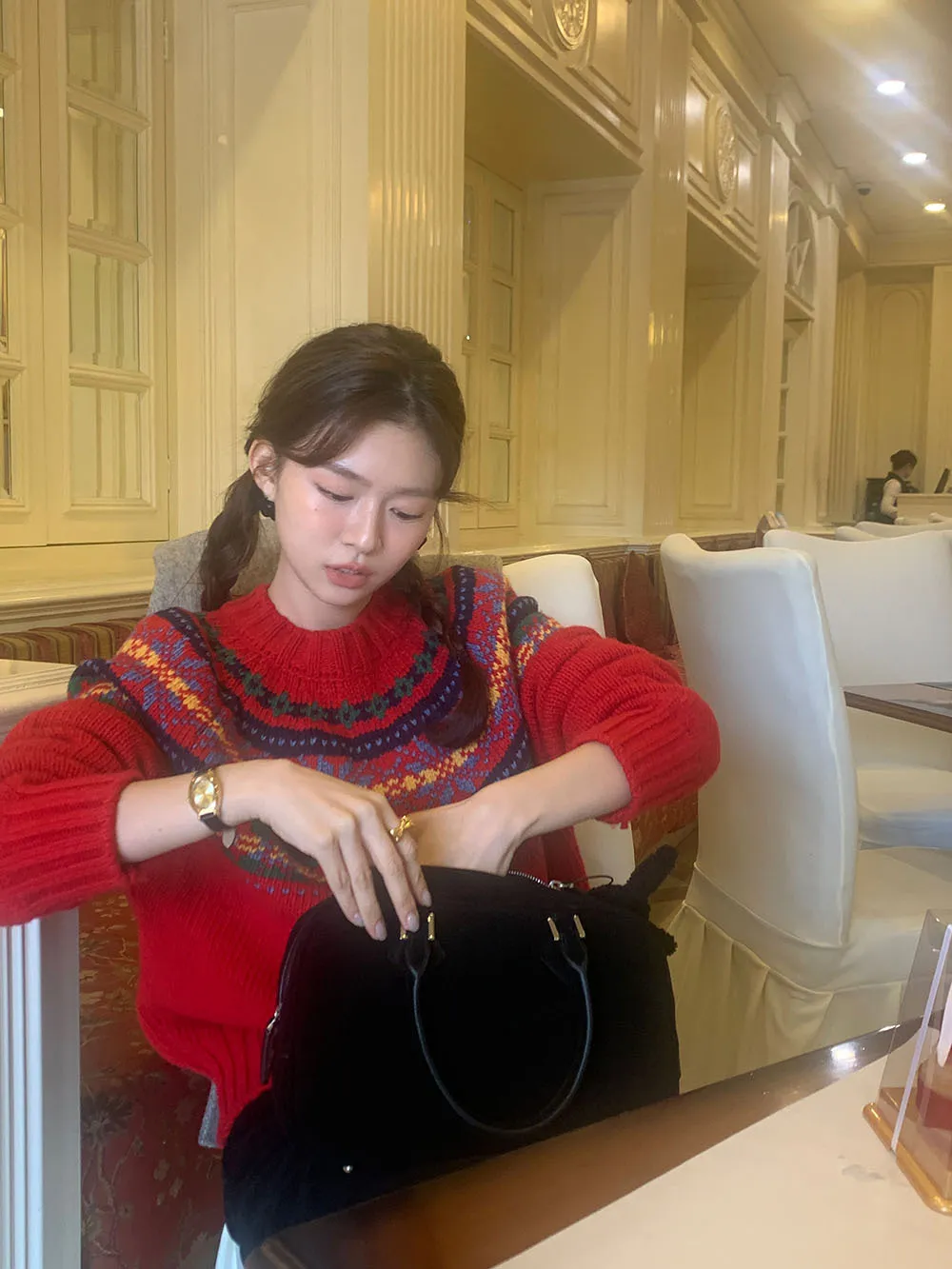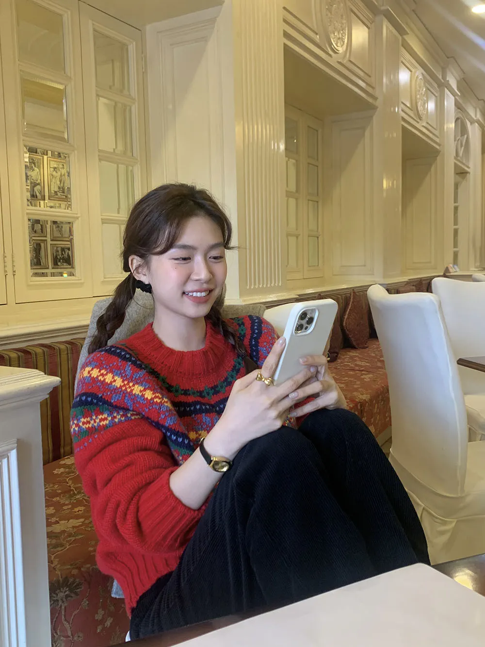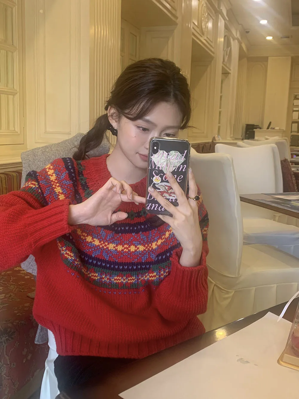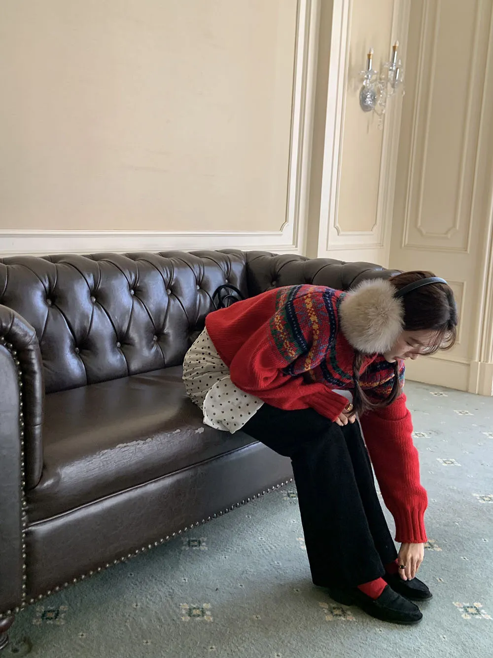 The sweater features a colorful jacquard pattern, inspired by retro holiday aesthetics. The intricate weaving adds a textured, festive look, perfect for creating a cheerful and vibrant outfit during the Christmas season. The mix of colors captures the essence of winter celebrations and brings a playful, cozy vibe to your wardrobe.