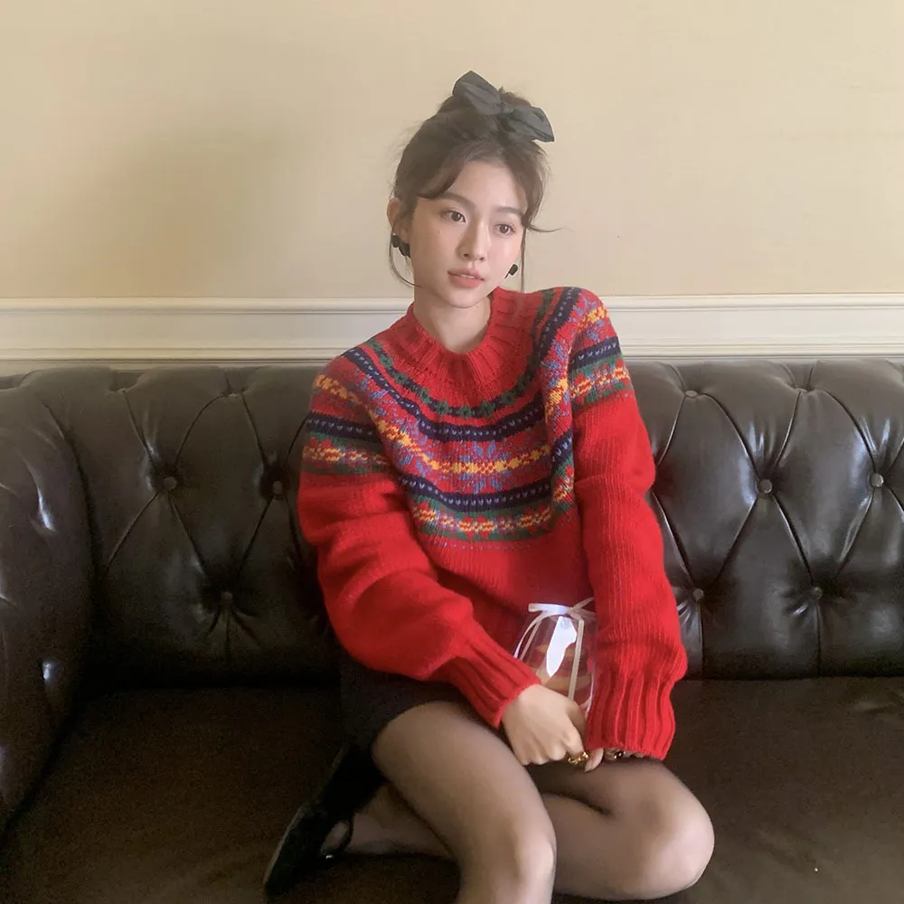 Autumn Winter Retro Round Neck Colorful Jacquard Christmas Atmosphere Thick Pullover Sweater