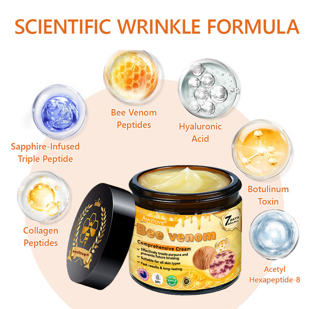 AWZLOVE® Bee Venom Comprehensive Cream provides a clinically-tested, powerful solution to combat wrinkles, skin laxity, and more, offering noticeable improvements in just 7 days. Say goodbye to harsh chemicals and invasive treatments, and say hello to younger, firmer, and more vibrant skin. If it doesn’t work, we offer a 100% money-back guarantee!