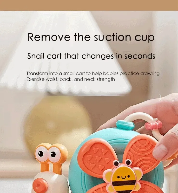 The toy helps babies learn how to entertain themselves during mealtime, promoting independent play. As they interact with the toy, they can explore its rotary features and engage with the colors and movement, which helps keep them occupied while allowing parents to focus on their own tasks.