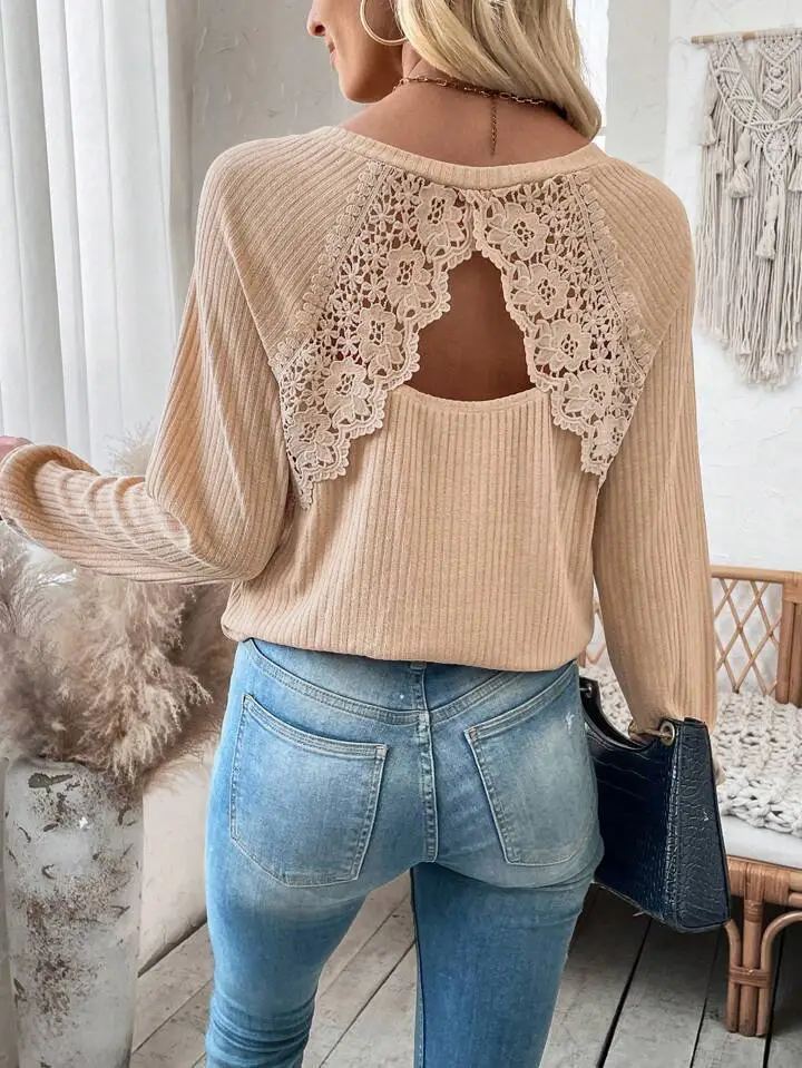 Back Stitching Lace Top, Lace Cutout Raglan Sleeve Top, Women's Long Sleeve Lace Top, Raglan Sleeve Lace Shirt, Elegant Lace Top for Women, Lace Cutout Long Sleeve Shirt, Chic Lace Raglan Top, Feminine Lace Shirt, Comfortable Lace Top for Women, Stylish Raglan Sleeve Shirt, Lace Design Top for Women, Trendy Lace Raglan Sleeve Top, Women's Fashion Lace Cutout Top, Stylish Long Sleeve Top with Lace, Unique Lace Raglan Shirt.