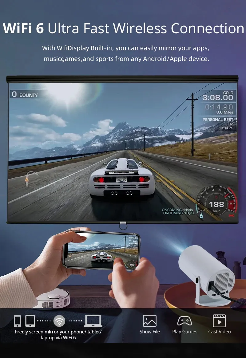 The HY300 Smart Barrel Machine Projector with AnzhuoHD Projection is the ultimate home entertainment system, designed to deliver a theater-like experience right in your living room. This compact and powerful projector offers stunning HD visuals, thanks to its advanced AnzhuoHD technology, which ensures crisp, bright, and immersive image quality. The barrel-shaped design is not only stylish but also practical, providing enhanced heat dissipation and durability for long-lasting performance. With its user-friendly interface and smart features, the HY300 projector supports a wide range of connectivity options, including HDMI, USB, and wireless streaming, allowing you to easily connect your favorite devices such as laptops, smartphones, gaming consoles, and more.