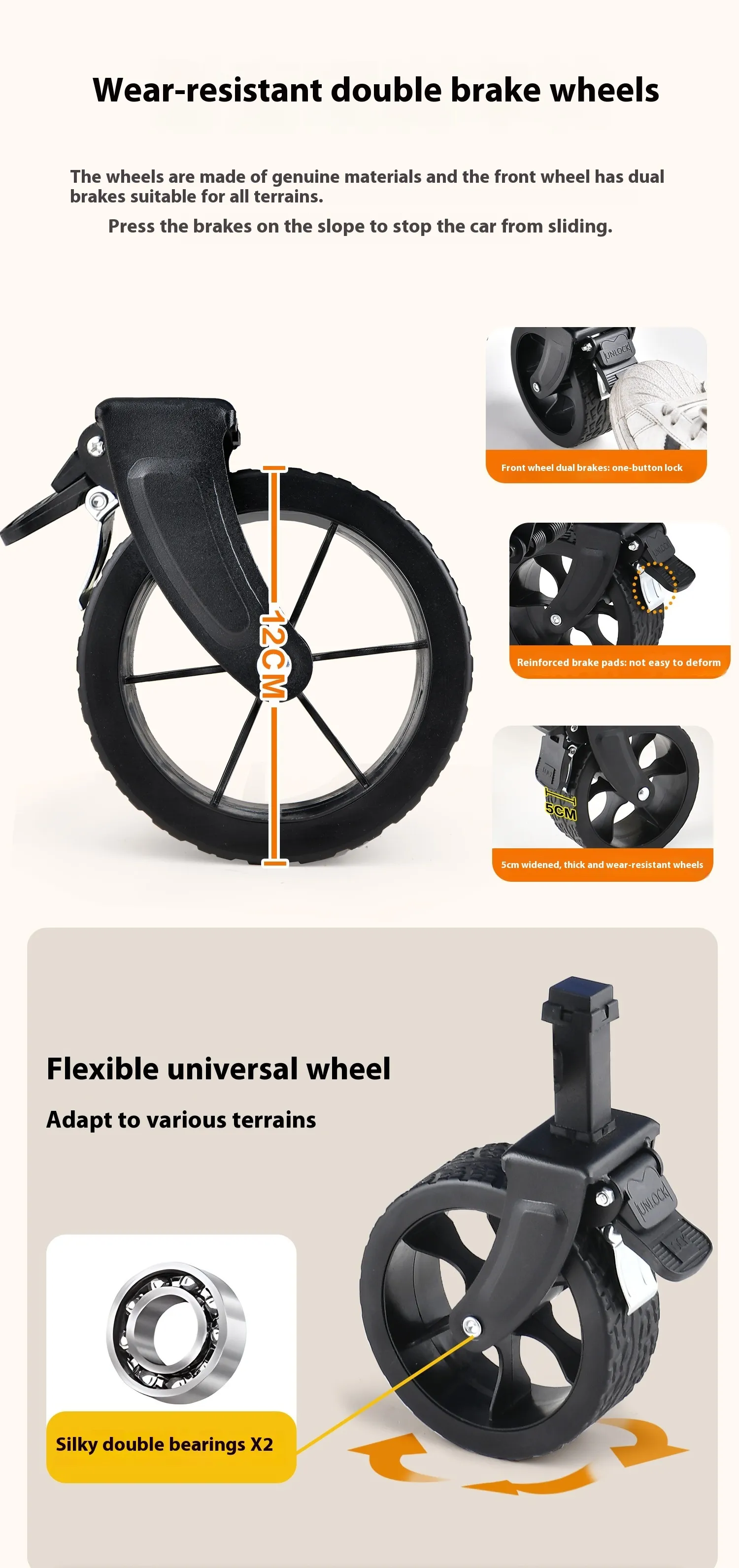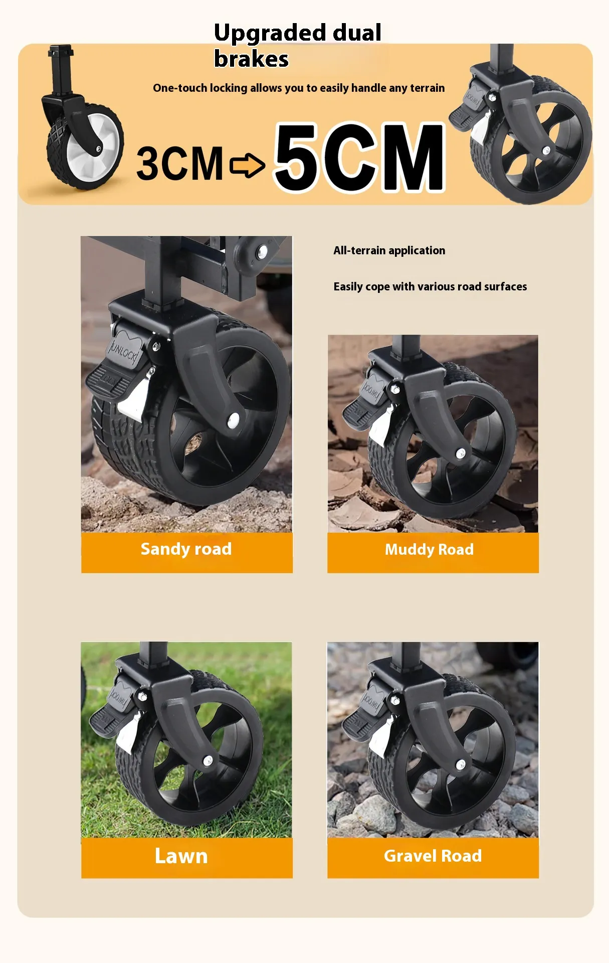 All-Terrain Wheels: Large, robust wheels designed for easy movement on sand, gravel, and uneven surfaces, ensuring