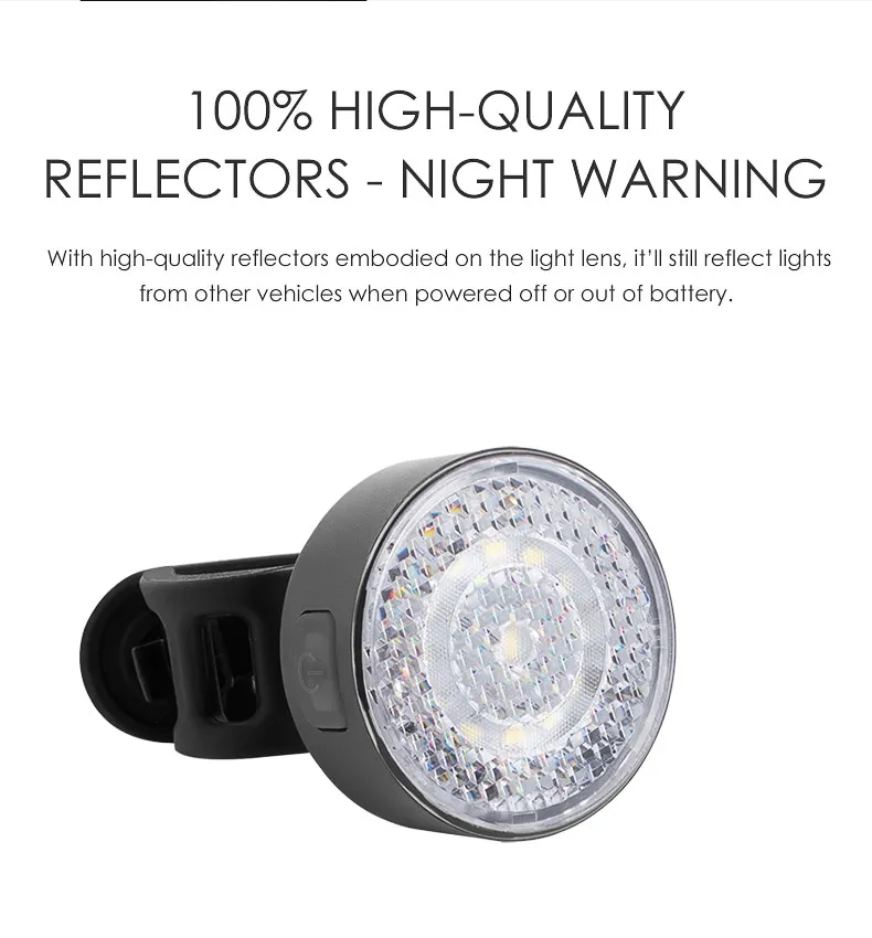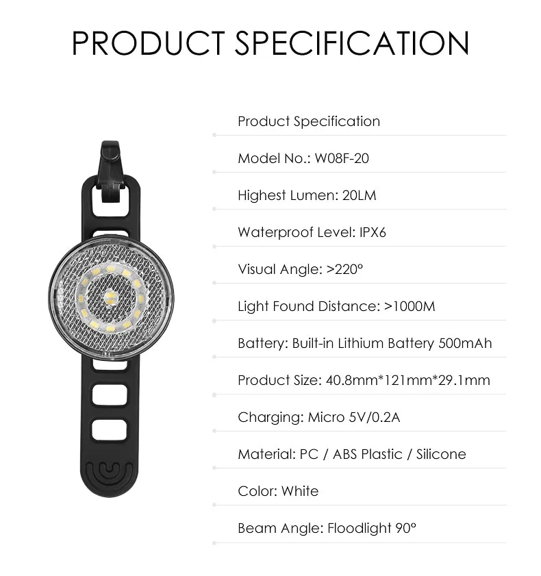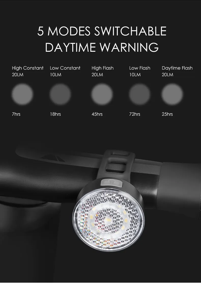 The front light W08 has 5 switchable modes, high brightness 20lumen. Unique daytime warning mode makes your bike safer during the day.