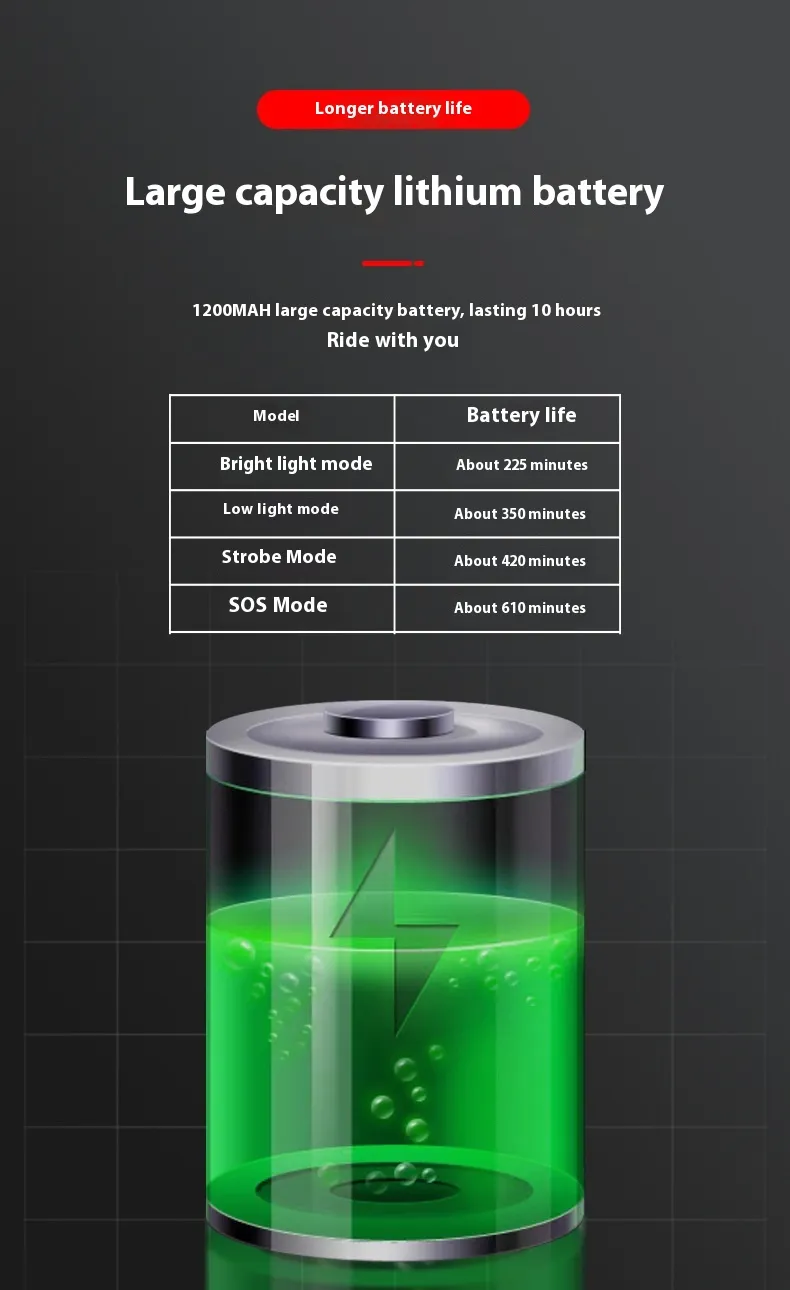 【USB Rechargeable】With Built-in 1200mAh lithium battery,used more convenience .With USB charging port, approx. 225 minutes In Strong Light Mode.