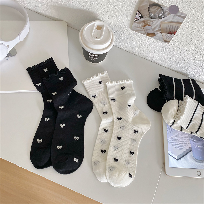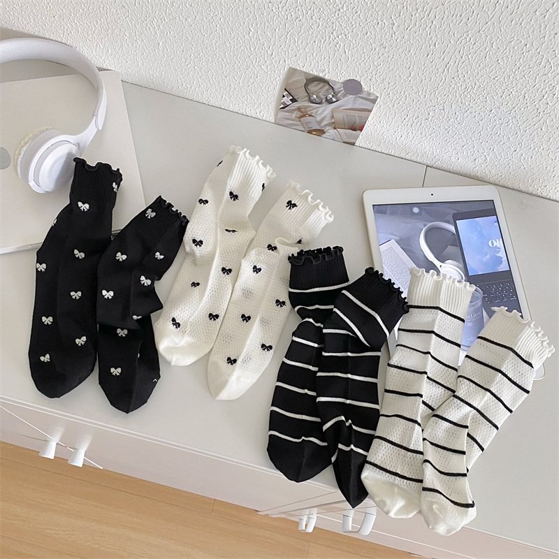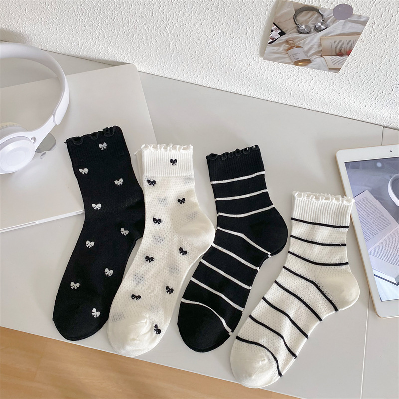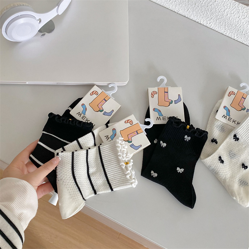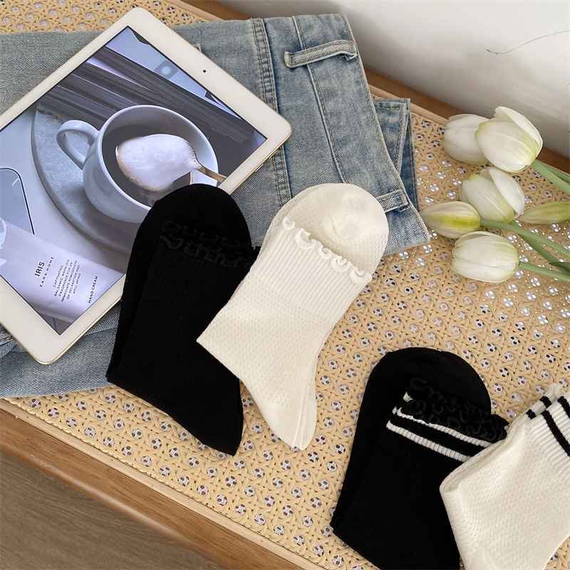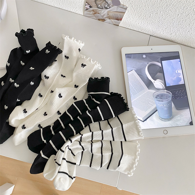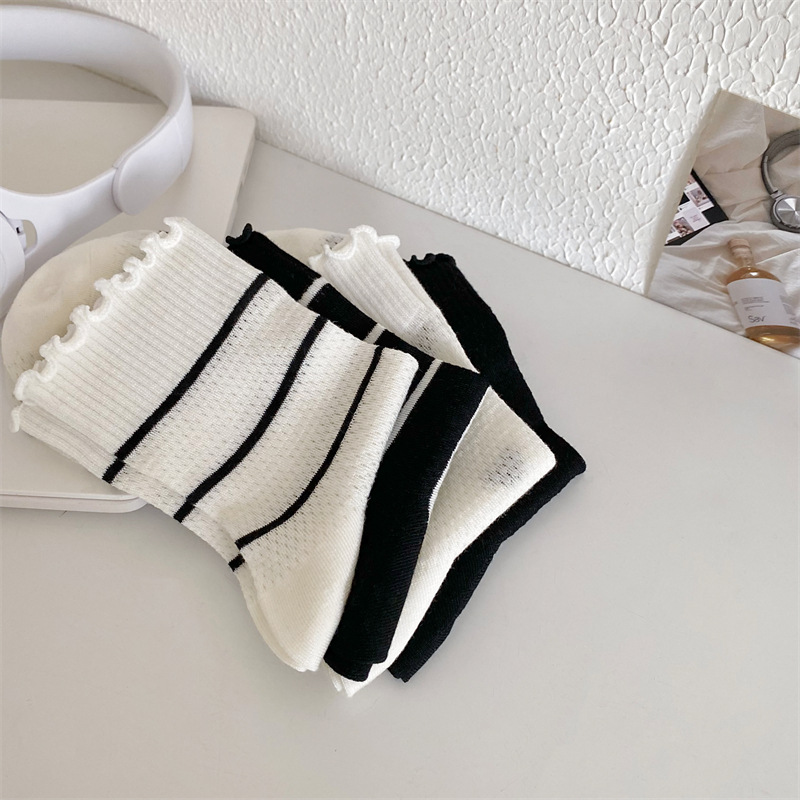 Black And White Openwork Breathable Women's Small Mid-calf Lace Women's Socks