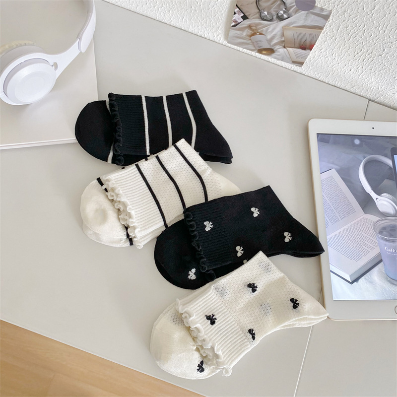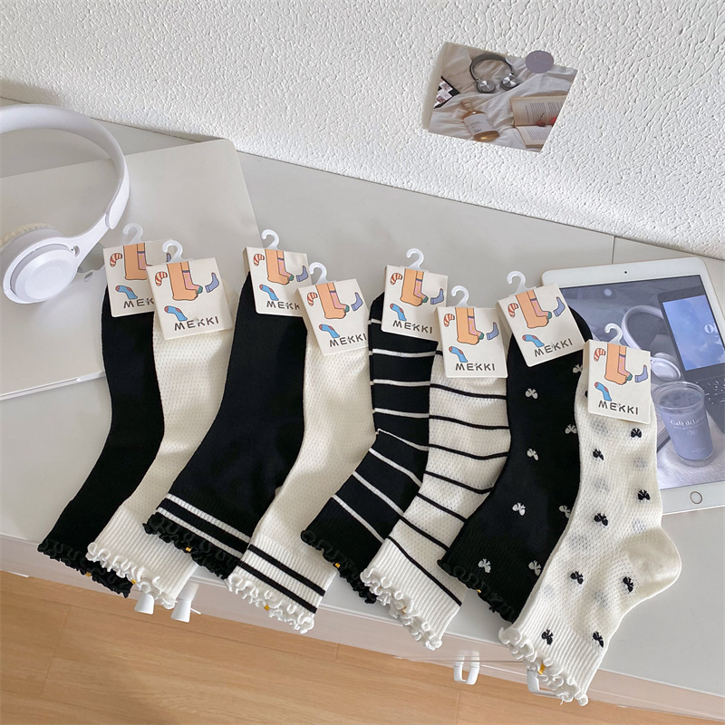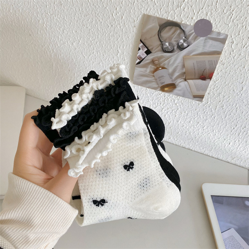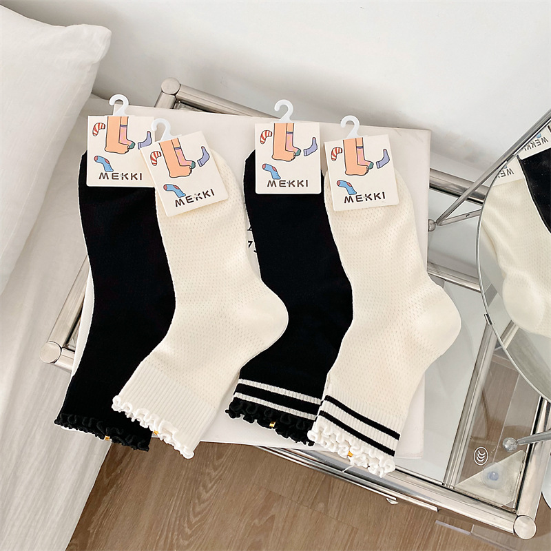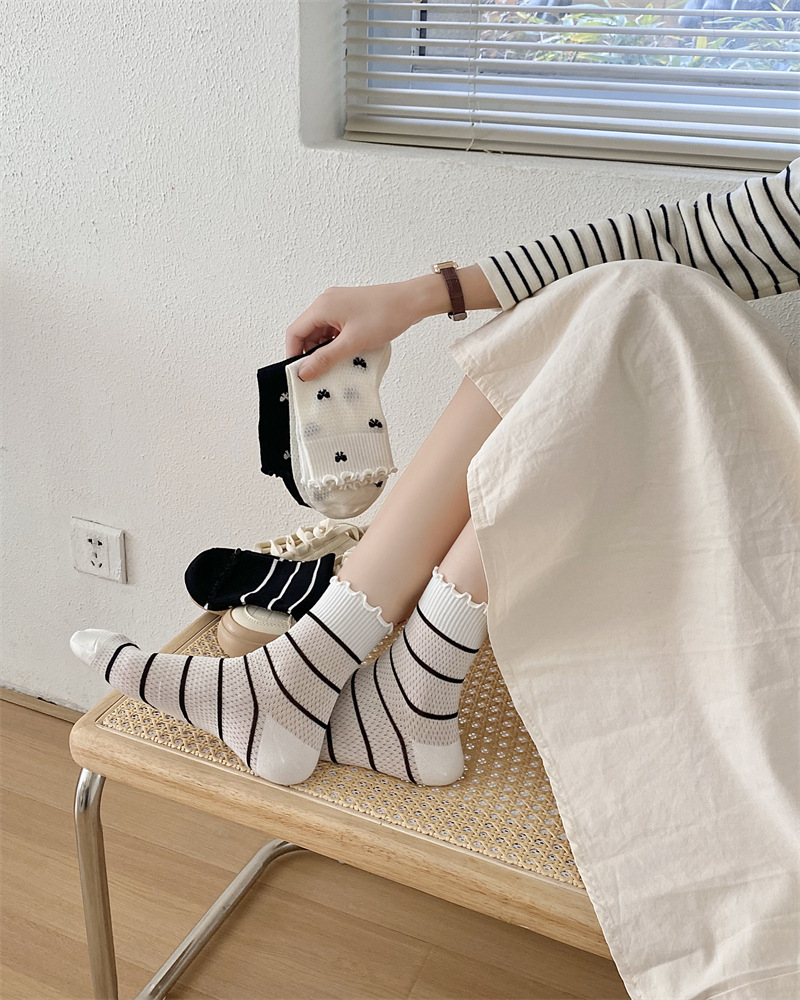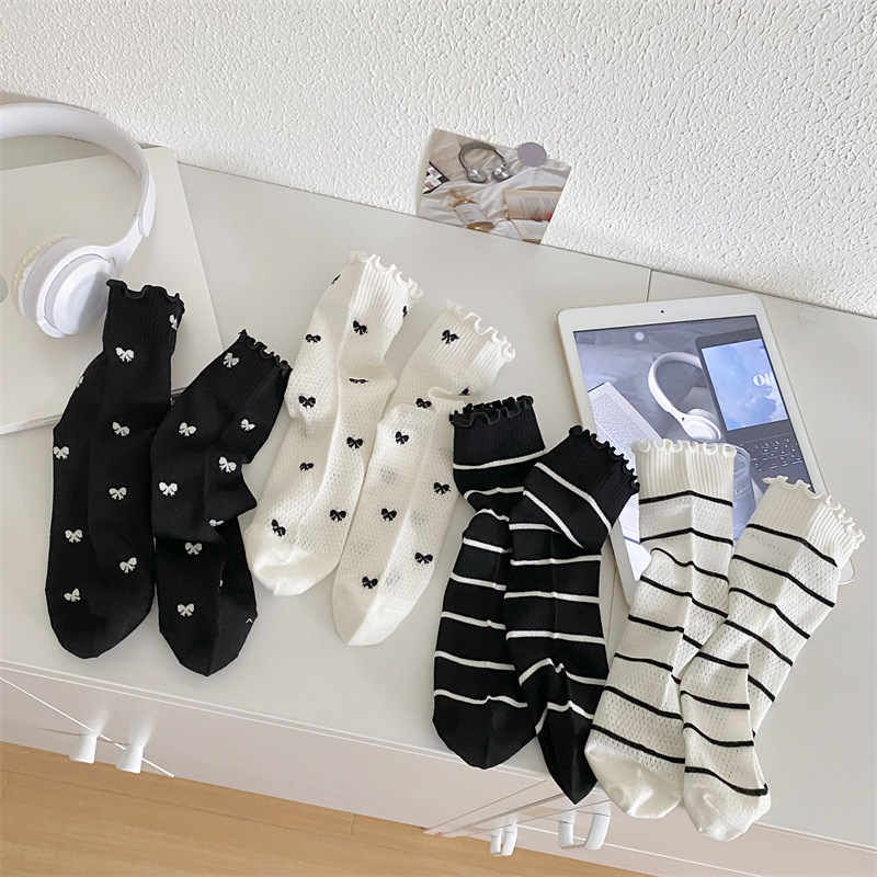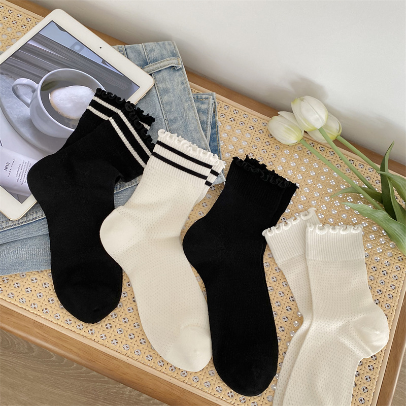 Black And White Openwork Breathable Women's Small Mid-calf Lace Women's Socks