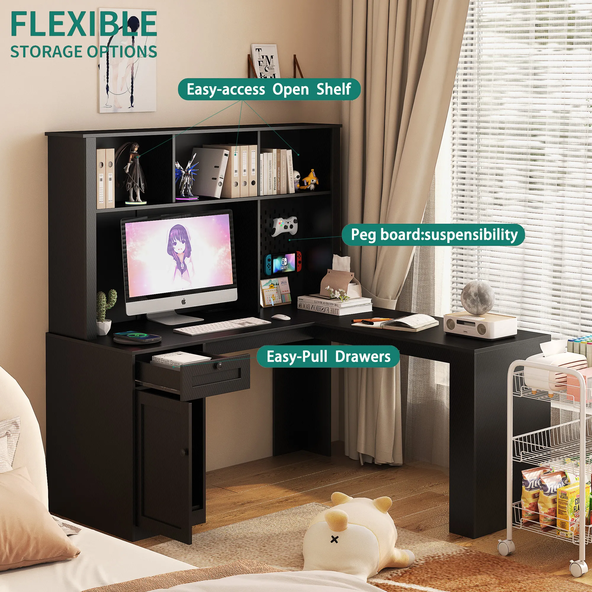 Product Name:L Shaped Desk with Charger,Computer Desk with Drawers,Bookshelf,Modern Corner Desk,Home Office Desk,L-Shaped Study Table Writing Desk,Carbon fiber Gaming Computer Desk with Storage,Black