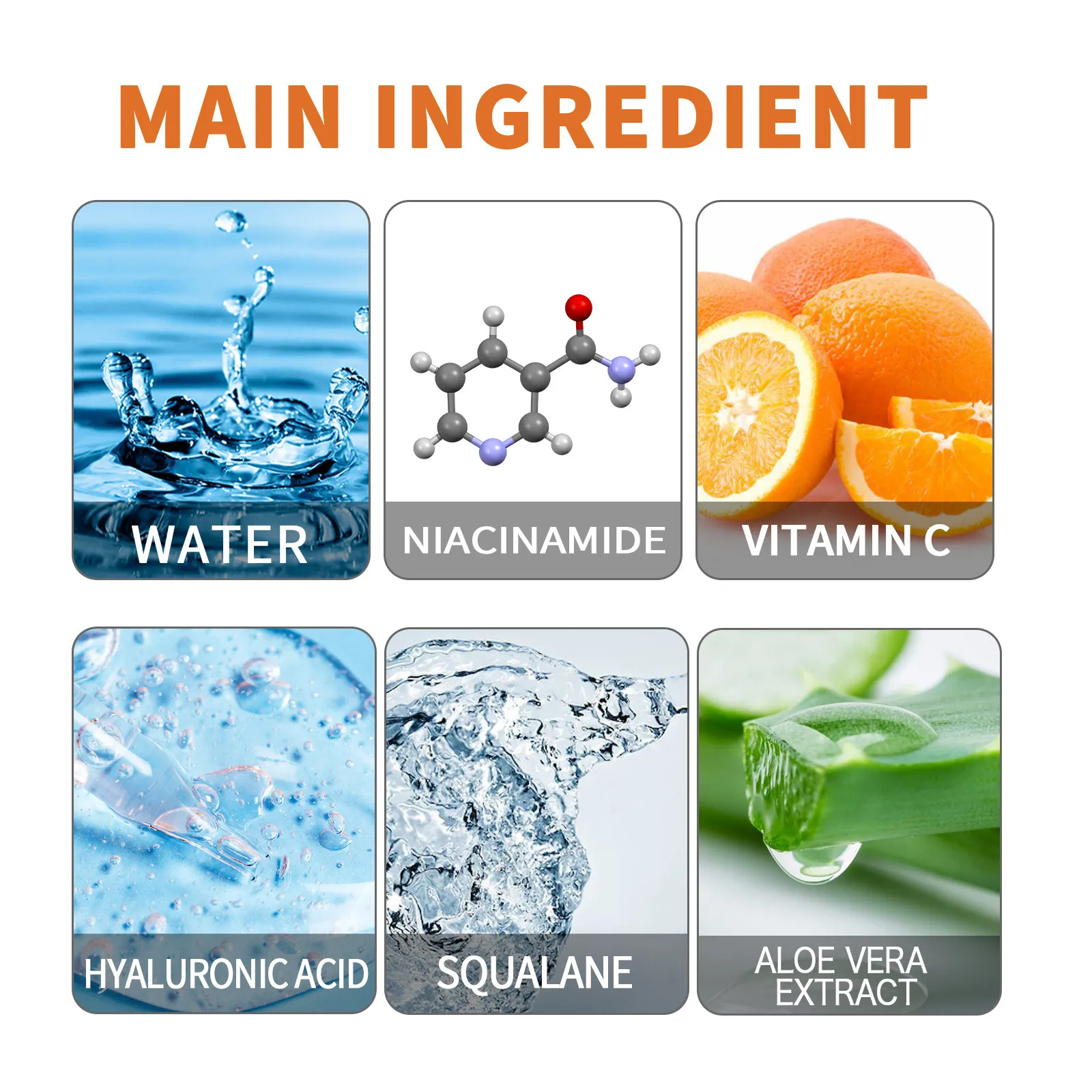Ingredients: Water, nicotinamide, vitamin C, hyaluronic acid,