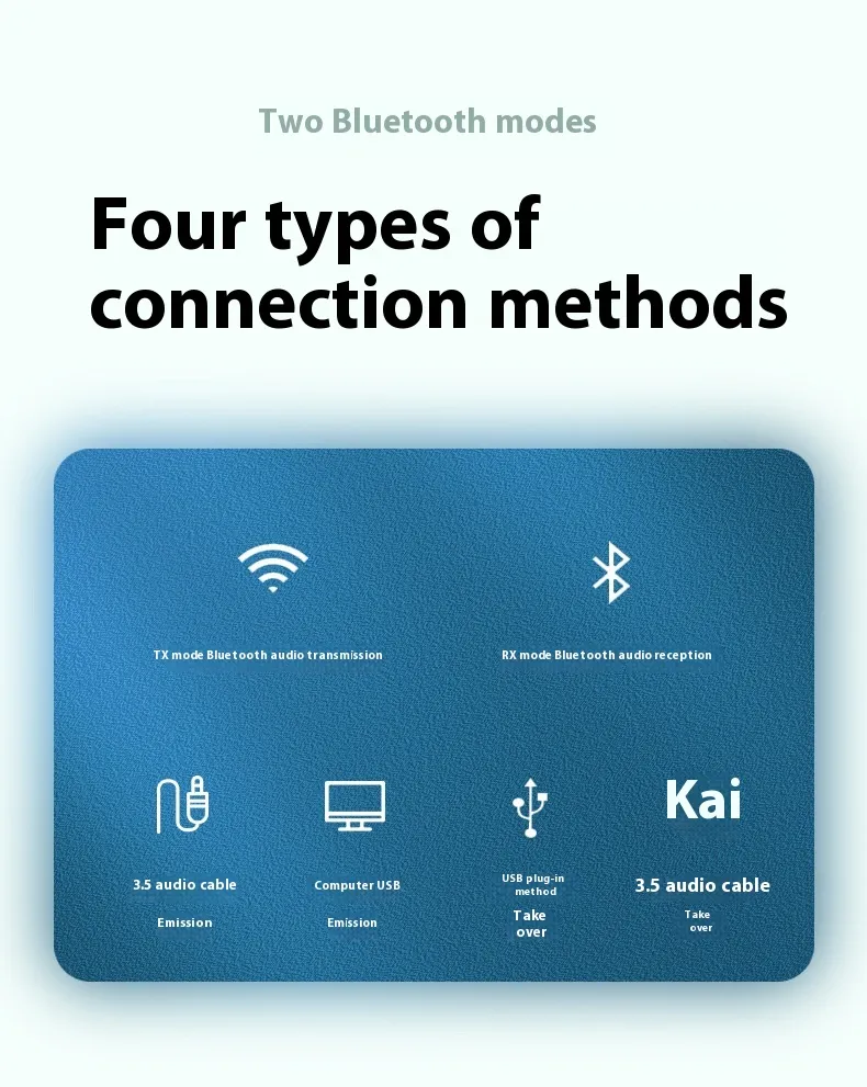 Transmitter Mode – sends audio via Bluetooth from a non-Bluetooth device (e.g., TV, PC) to Bluetooth headphones or