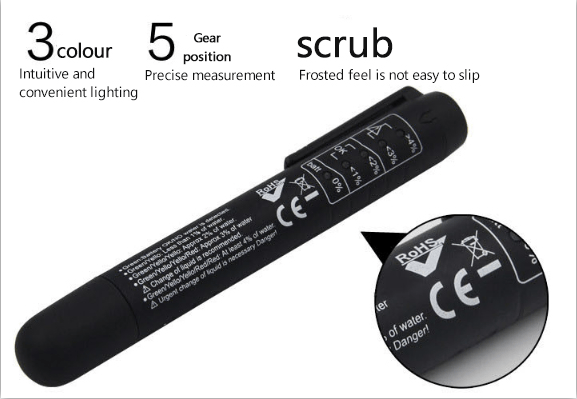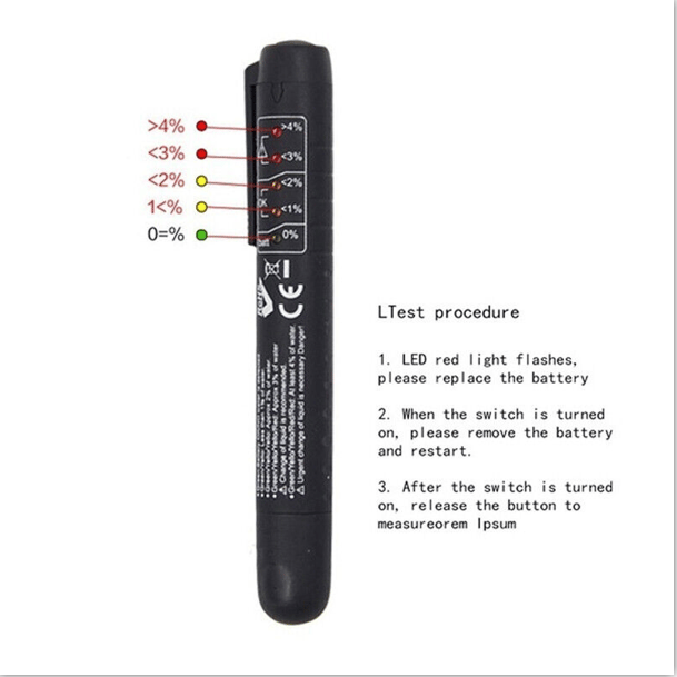 5 LED lights display the percentage of moisture content in brake fluid, provides more accurate test result, oil-proof and oxidation-proof, with good condition and high precision.