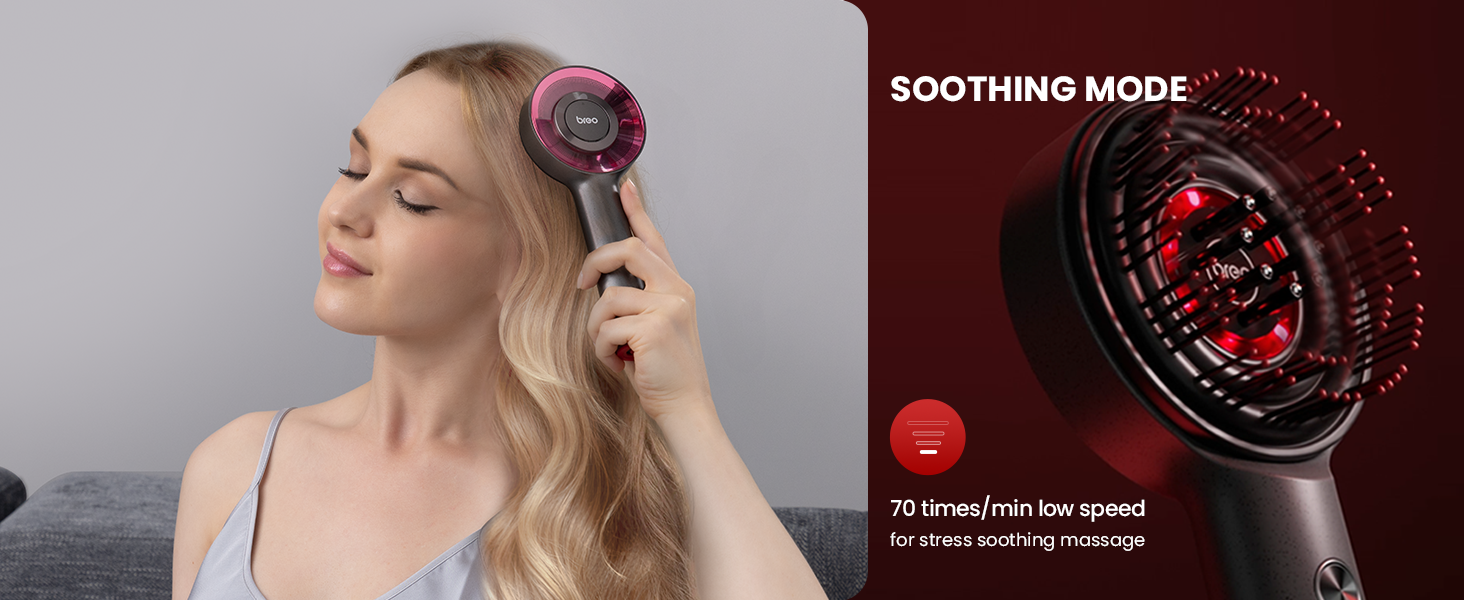 - 【Experience the Real Feel of Shiatsu】 The Breo Scalp3 massaging comb replicates the soothing touch of human hands, enhancing the absorption through a revitalizing 360° kneading massage, doubling the effect of essential oils or any nutrient treatment. Unlock your scalp spa experience with three customizable modes (soothing, refreshing, relaxing) and 72 massaging bristles!