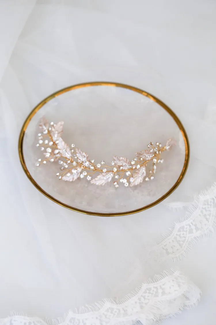 The crown is studded with high-quality rhinestones that catch the light beautifully, adding a subtle yet glamorous sparkle to your hairstyle. The rhinestones are carefully placed along the branches, creating a refined, radiant look that elevates your bridal attire and draws attention to your face, creating a sparkling effect as you move.