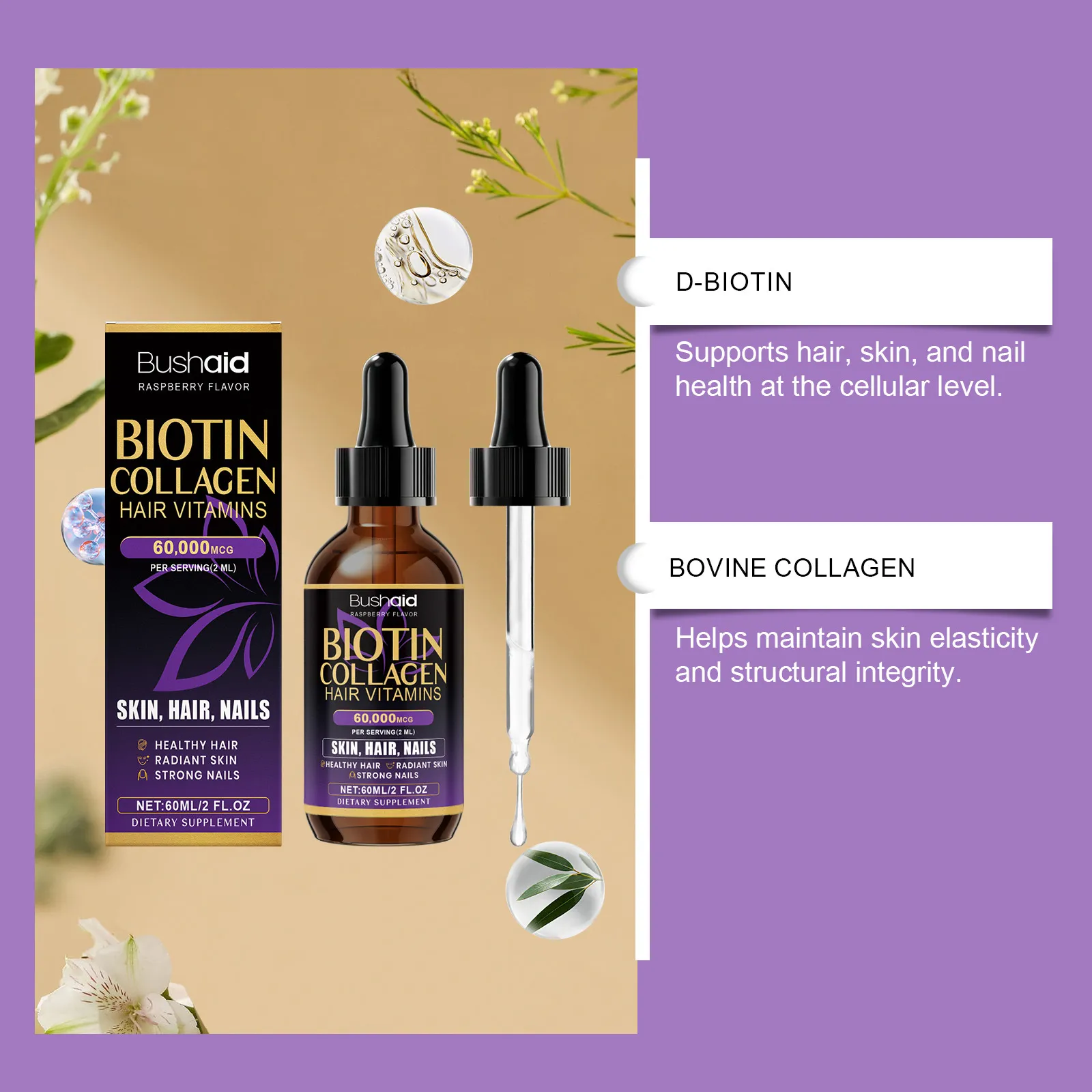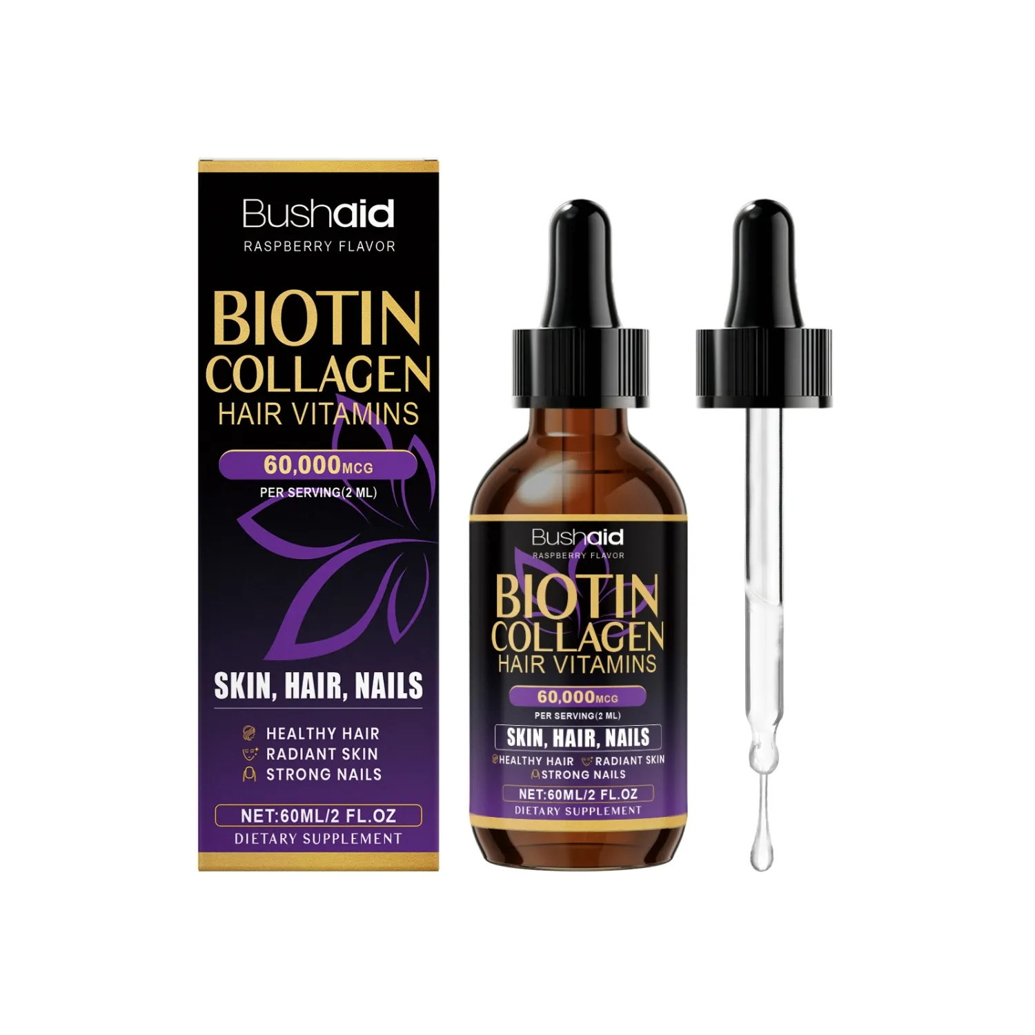 Bushaid biotin collagen, Bushaid hair vitamins, biotin collagen liquid supplement, hair skin nails vitamins, liquid biotin drops, biotin collagen drops, high strength biotin supplement, raspberry biotin liquid, Bushaid dietary supplement, skin hair nails support