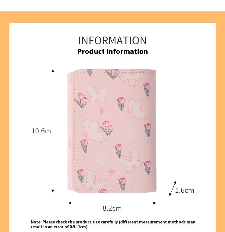 In summary, the Butterfly-Patterned Short Style Three-Fold Wallet is the perfect blend of beauty and functionality. Its stylish butterfly design, practical three-fold structure, durable construction, and thoughtful organization features make it the ideal choice for anyone in need of a compact yet spacious wallet. Whether you are looking for a gift for a loved one or a wallet for daily use, this wallet is a must-have accessory that combines elegance with practicality.