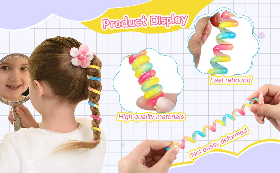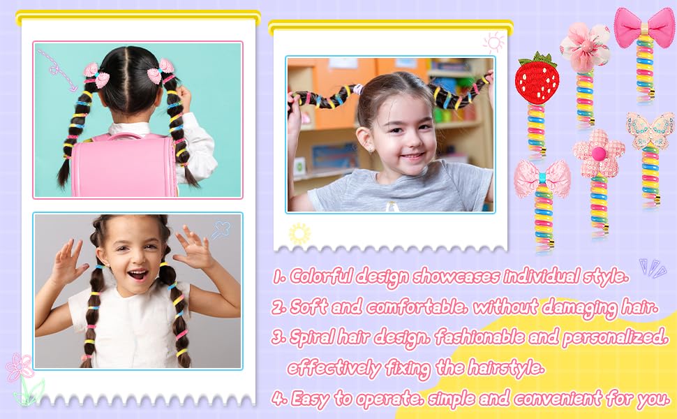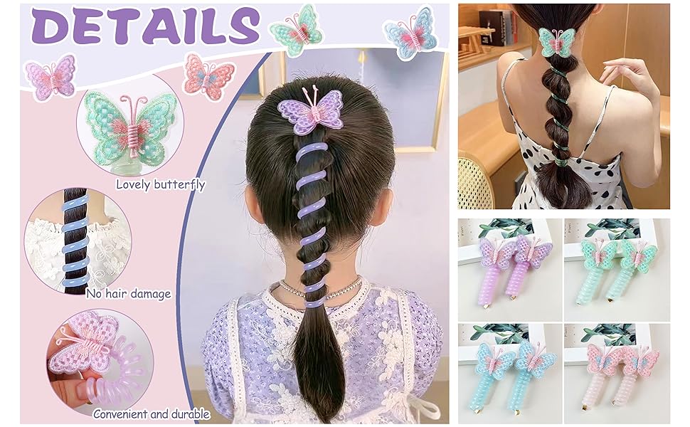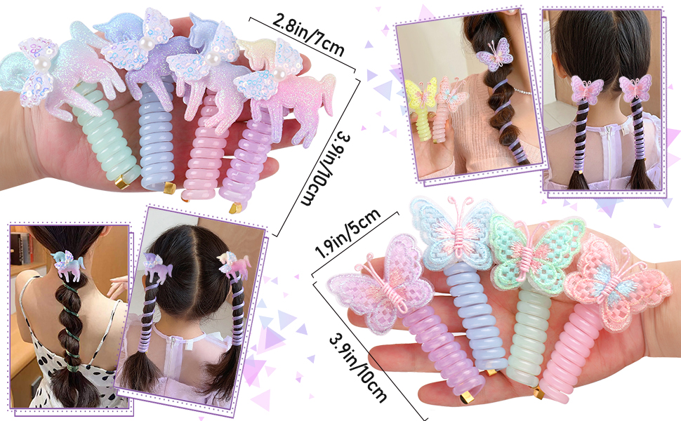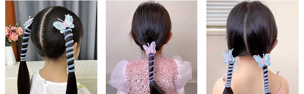 - ã€Different and Unique】Telephone wire hair ties makes an ordinary Braid to a fun hair style,help little girls playing dress up or wanting to add color and fun to their hair styles.also can use the ponytail holder for dressing up dolls.The color butterfly spiral hair ties design of these hair bands makes it easy to wrap around ponytail hair and ensure it in place without causing creases or kinks in the hair.