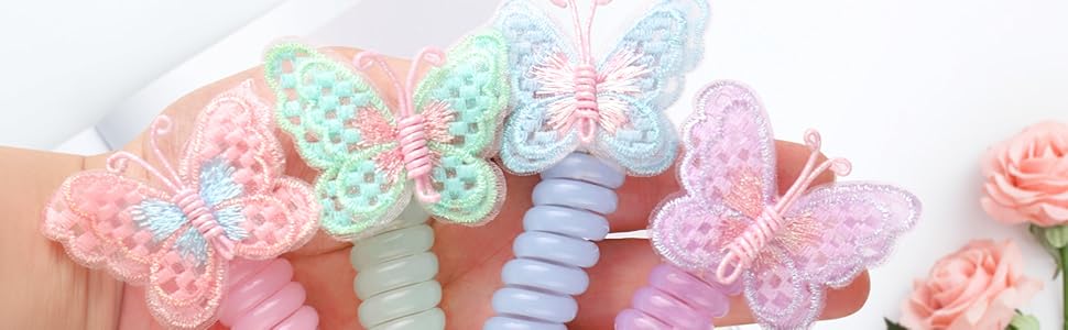 - ã€Butterfly Design Spiral Hair Tie】 These colorful telephone wire hair bands for kids come in a wide range of vibrant colors, adorable cartoons butterfly patterns. These designs are sure to catch the attention of both kids and adults alike.