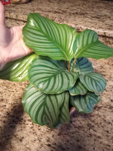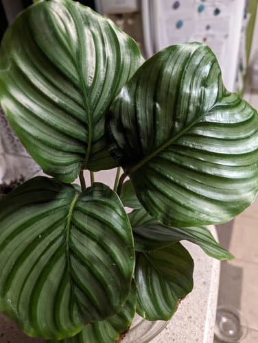 These Calathea will mature into large leaves with a silvery shine. Some leaves may sustain small blemishes, but are more than capable of bouncing back providing the correct care and conditions.