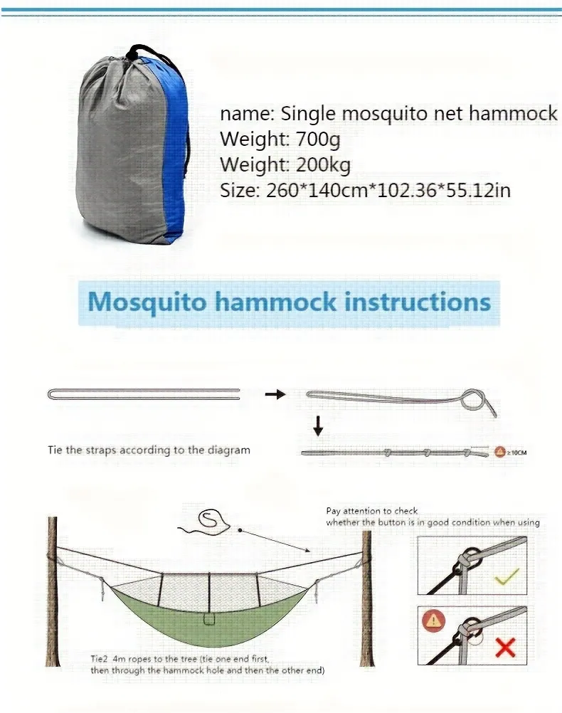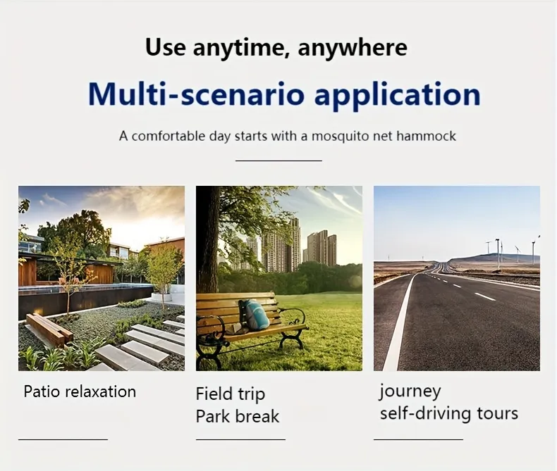 Whether you’re exploring trails, camping in the forest, or relaxing on a beach, the Double Camping Hammock with Mosquito Net is versatile enough for all types of outdoor activities. Its lightweight and compact design make it easy to bring along on any adventure, while the mosquito net and durable fabric provide a comfortable place to sleep. This hammock is ideal for travelers and nature lovers who appreciate comfort, protection, and convenience in their outdoor gear.