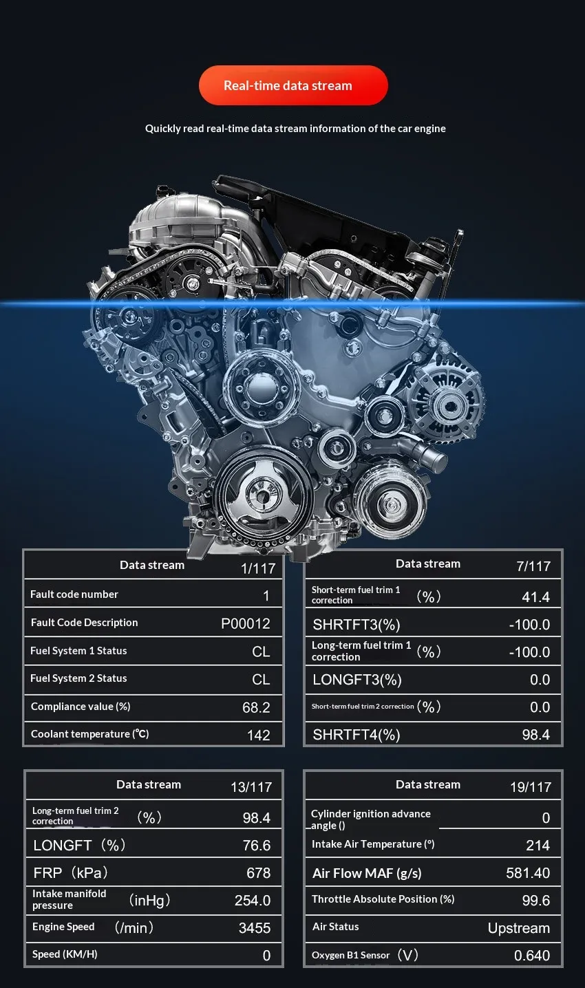 Instead of just showing numeric trouble codes, a good scanner displays live data from oxygen sensors, throttle position sensors, coolant temperature sensors, mass air flow sensors, and more. These real‑time readings help you assess operational conditions and detect abnormalities.