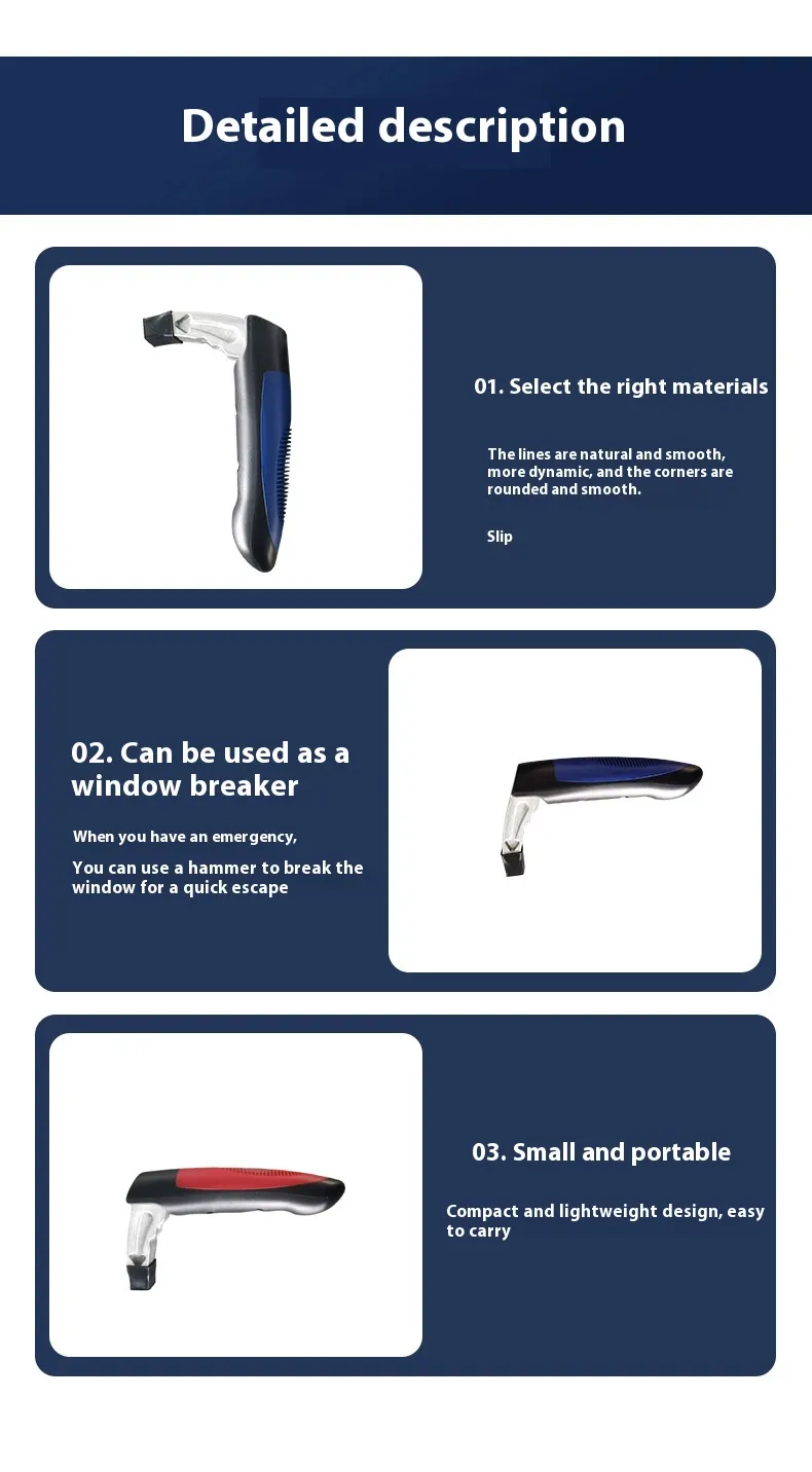 - Portable grip can double up as an “Accident Emergency Tool”. It has a built-in seat belt cutter and hammer feature to break glass in case of emergencies.