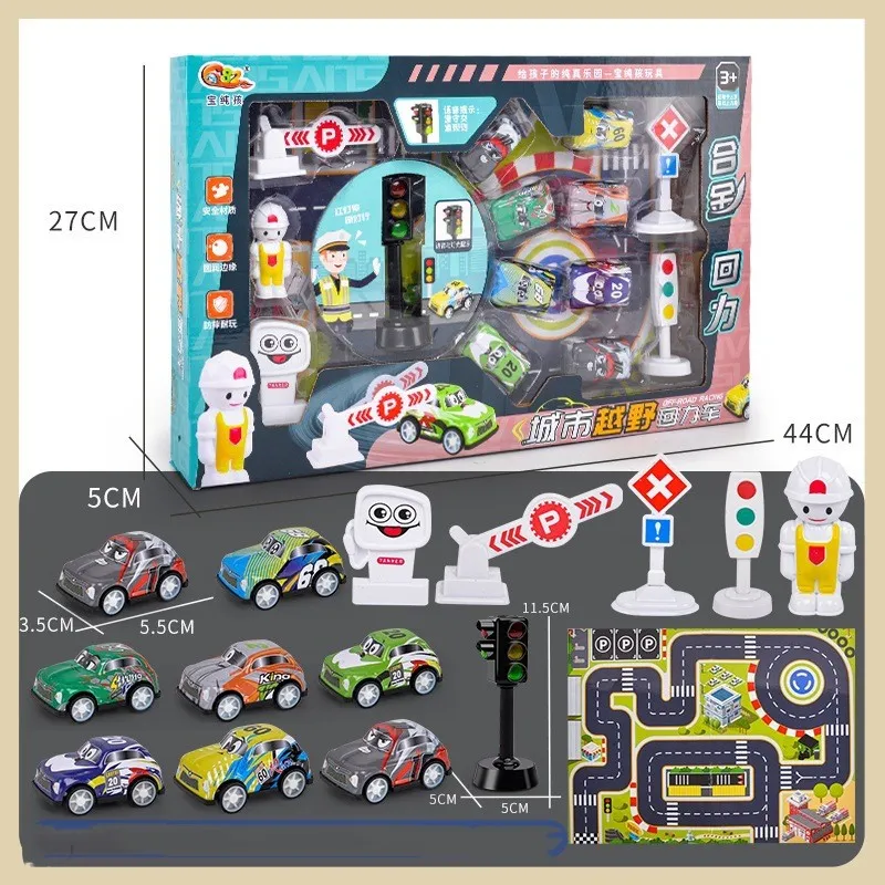 boxes with racing road signs with maps 6399-7, 14 metal sliding cars with traffic lights [big gift box - 3], 10 metal car sets with