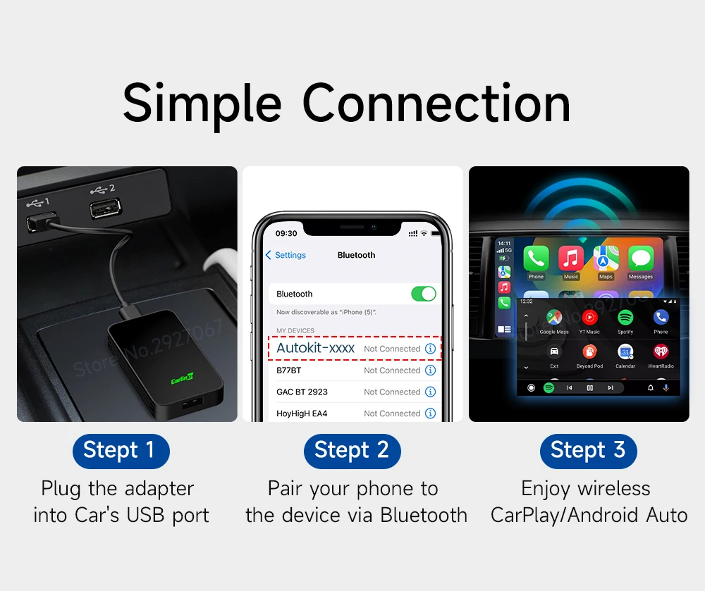 A: Installation is simple. Plug the adapter into your car's USB port that currently supports wired CarPlay. The device will automatically initiate, and you can pair your phone via Bluetooth and Wi-Fi following the on-screen prompts.