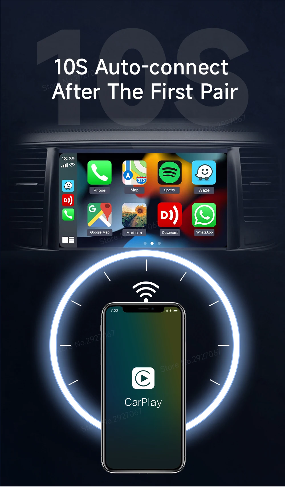 5.8GHz transmission rate, fast data transmission speed and low latency makes it simple for users to connect to existing USB-enabled Android Auto or Apple CarPlay vehicles wirelessly, making it even easier to access apps using the car's display.