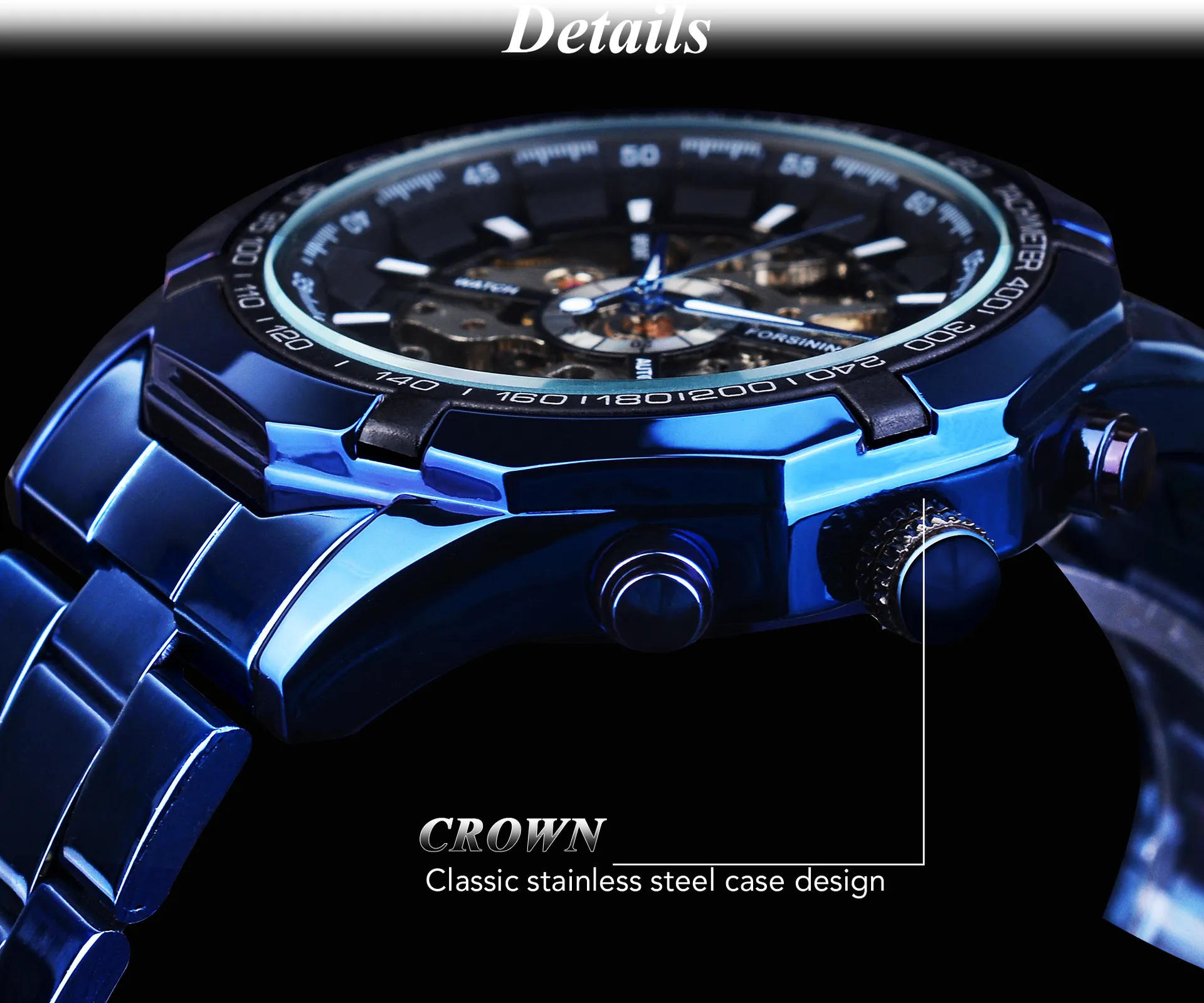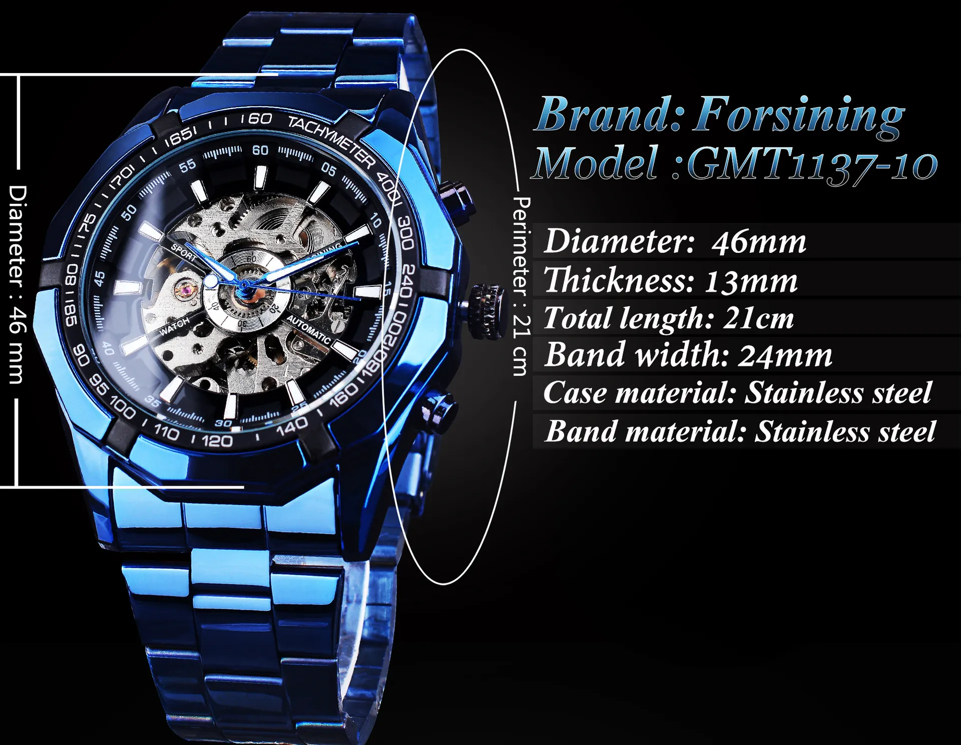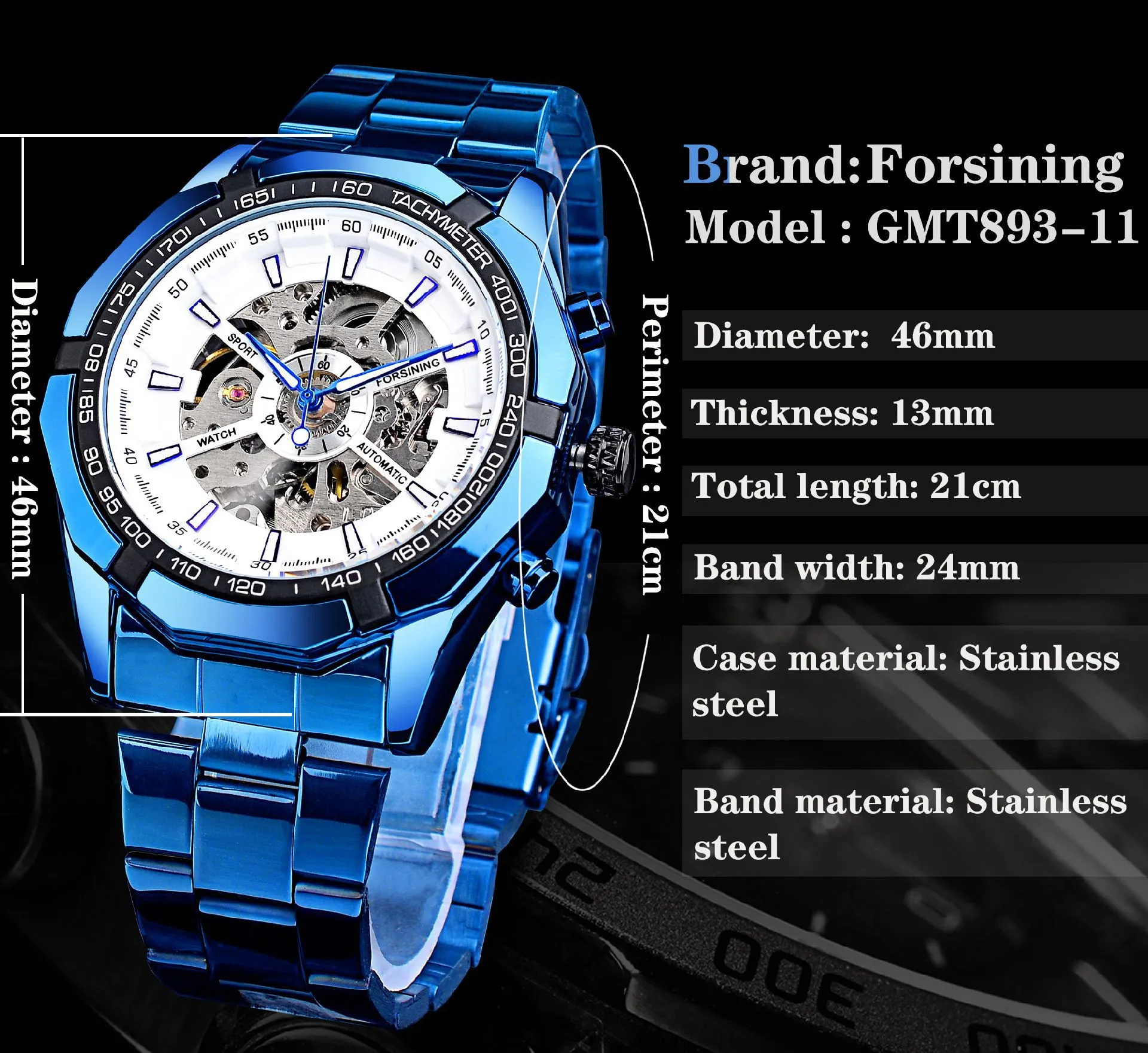 - Material: Stainless steel case with blue plating accents