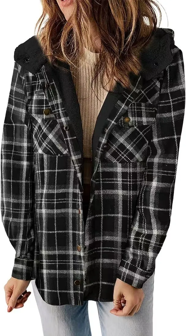 Casual Plaid Hooded Woolen Coat Thickened Fleece-lined Warm Jacket