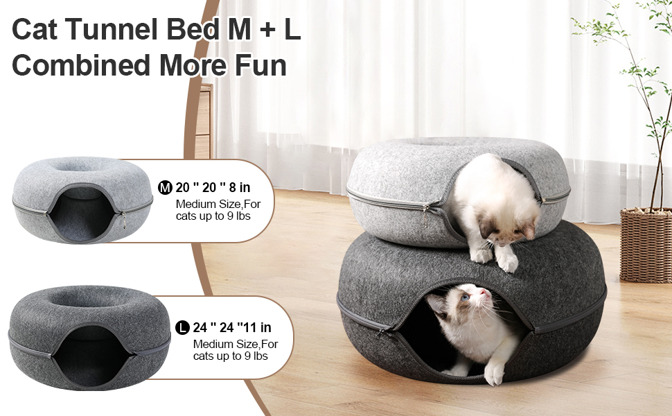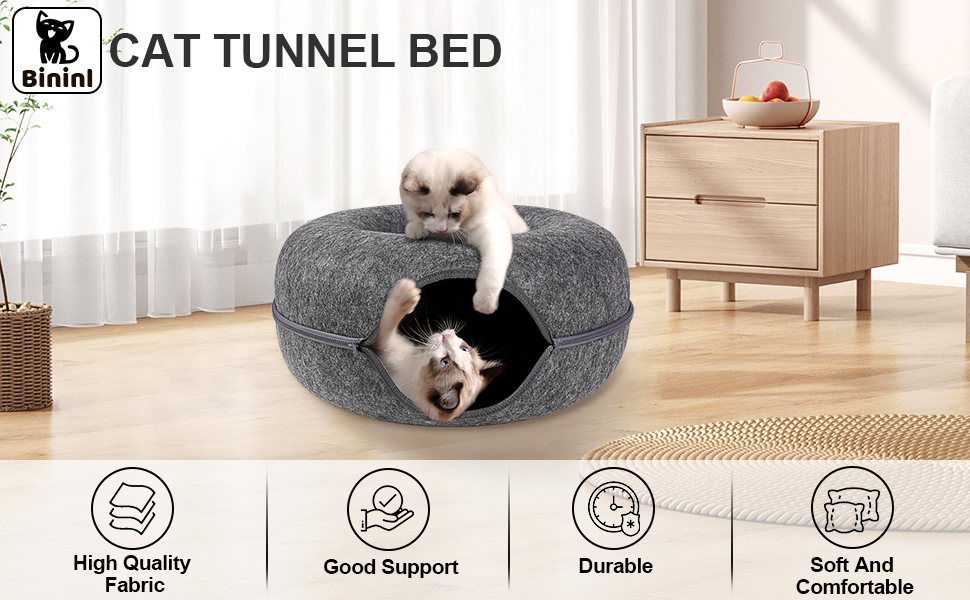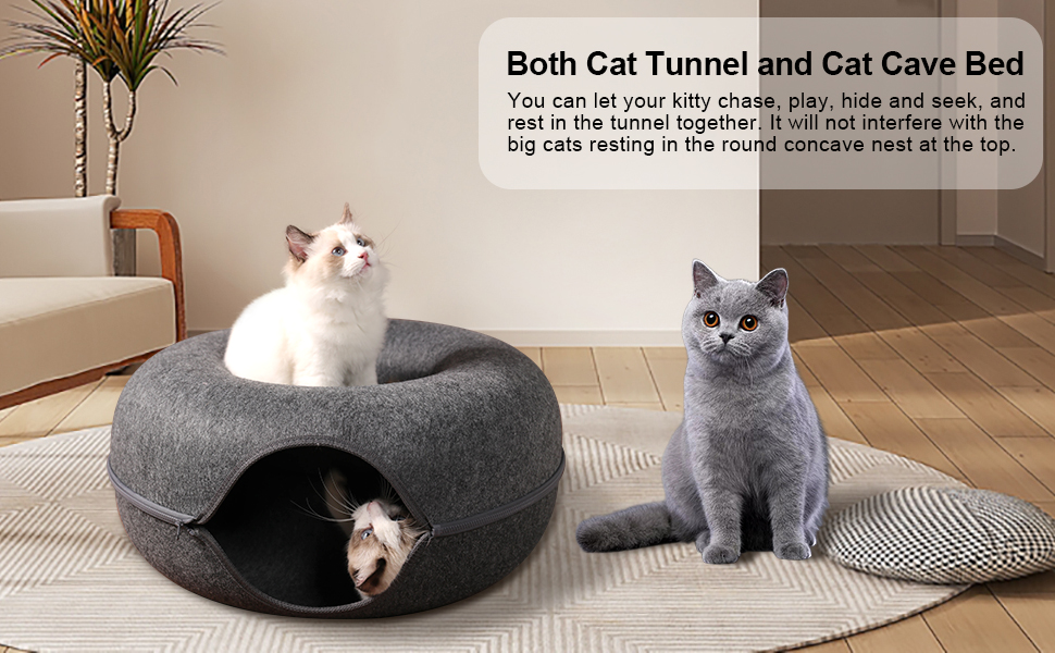 - Dual Function:Bininl Cat Tunnel adopts a double layered composite donut/circular design, meeting the needs and desires of cats for drilling and playing, bringing infinite fun to cats.The concave design of the dome of the cat tunnel bed allows another cat to rest, allowing both cats to use it simultaneously without interfering with each other.