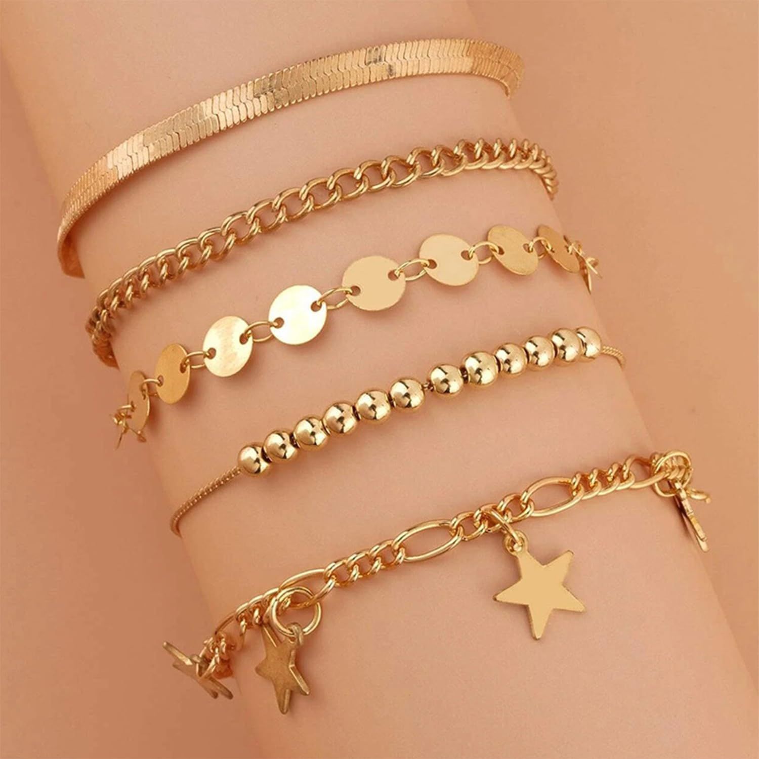 Description: Step into the world of elegance and style with the Celestial Dreams Multi-Layer Anklet Set, a stunning collection of anklets designed to add a touch of glamour to your beachwear or everyday outfits. This exquisite set features multiple layers, including a chic Cuban link chain, a delicate wafer chain, a sleek herringbone chain, a charming beaded chain, and a playful star charm chain. Each anklet is crafted from high-quality materials and finished with a radiant golden hue, ensuring durability and a lasting shine.