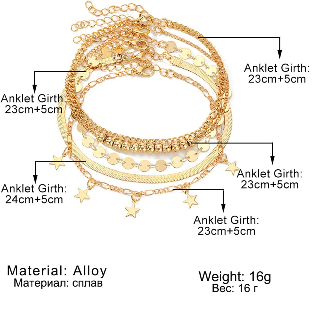 Description: Step into the world of elegance and style with the Celestial Dreams Multi-Layer Anklet Set, a stunning collection of anklets designed to add a touch of glamour to your beachwear or everyday outfits. This exquisite set features multiple layers, including a chic Cuban link chain, a delicate wafer chain, a sleek herringbone chain, a charming beaded chain, and a playful star charm chain. Each anklet is crafted from high-quality materials and finished with a radiant golden hue, ensuring durability and a lasting shine.