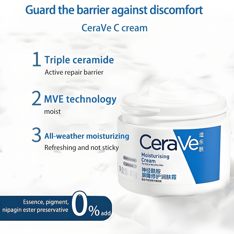 provides immediate comfort to tight, flaky, or irritated skin while continuing to hydrate throughout the day and night. This makes it suitable for use in New Zealand’s changing climate, from dry winter conditions to sun-exposed summer environments. Designed with sensitive skin in mind, the formula is alcohol-free, fragrance-free, and pigment-free, reducing the risk of irritation and making it appropriate for reactive or allergy-prone skin. It works well as a daily facial moisturiser, body cream, or targeted repair cream for areas prone to dryness such as hands, elbows, knees, and legs. CeraVe Moisturising Cream is suitable for long-term daily use and integrates easily into simple or dermatology-guided skincare routines. Its gentle formulation focuses on skin health rather than cosmetic masking, helping restore balance and comfort with consistent application.