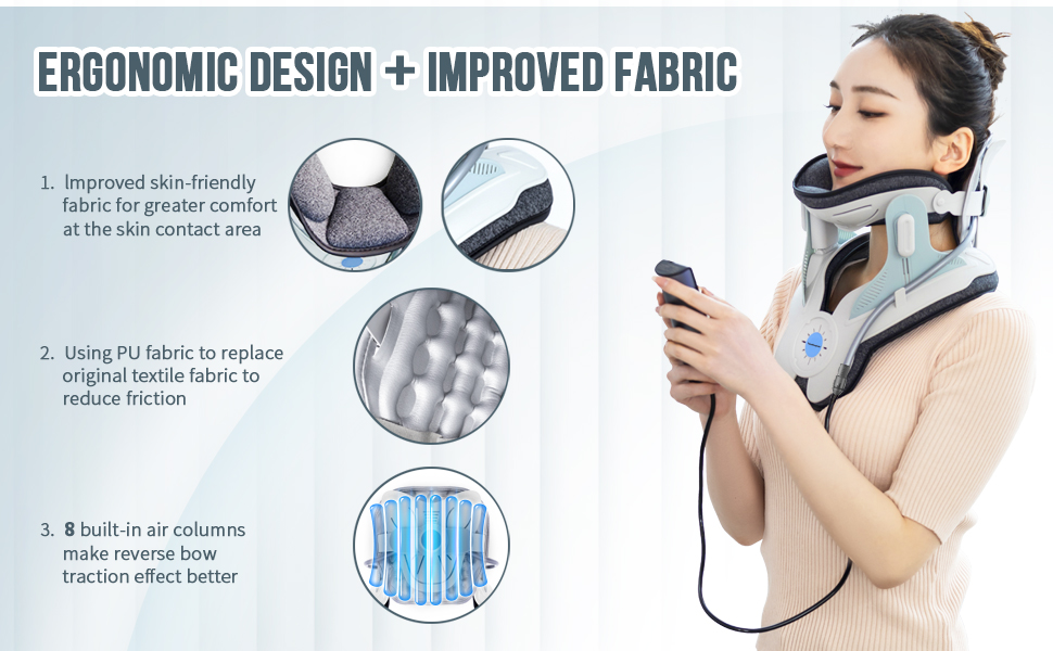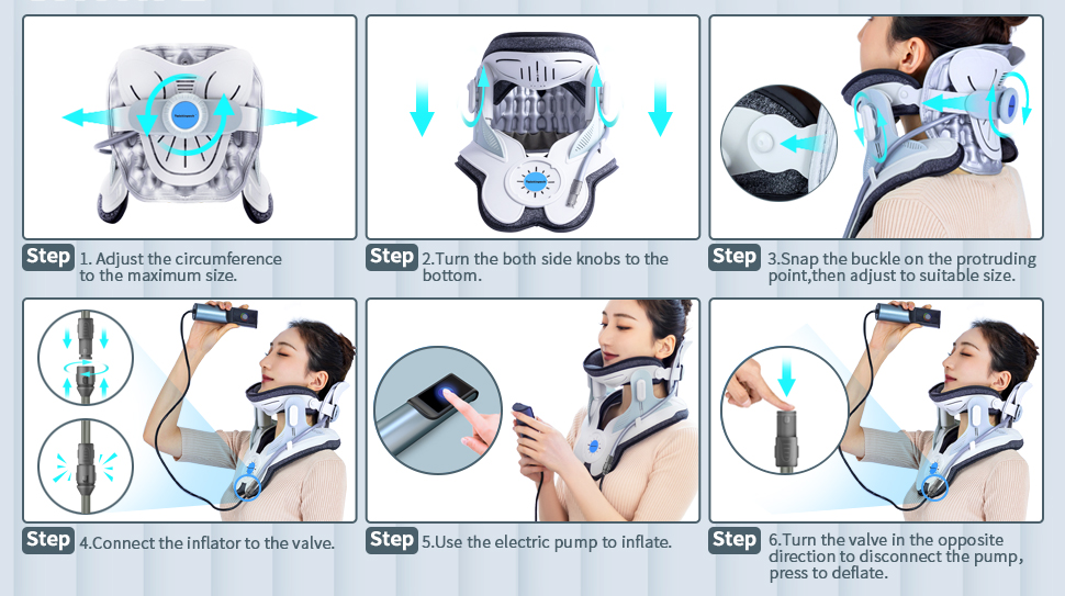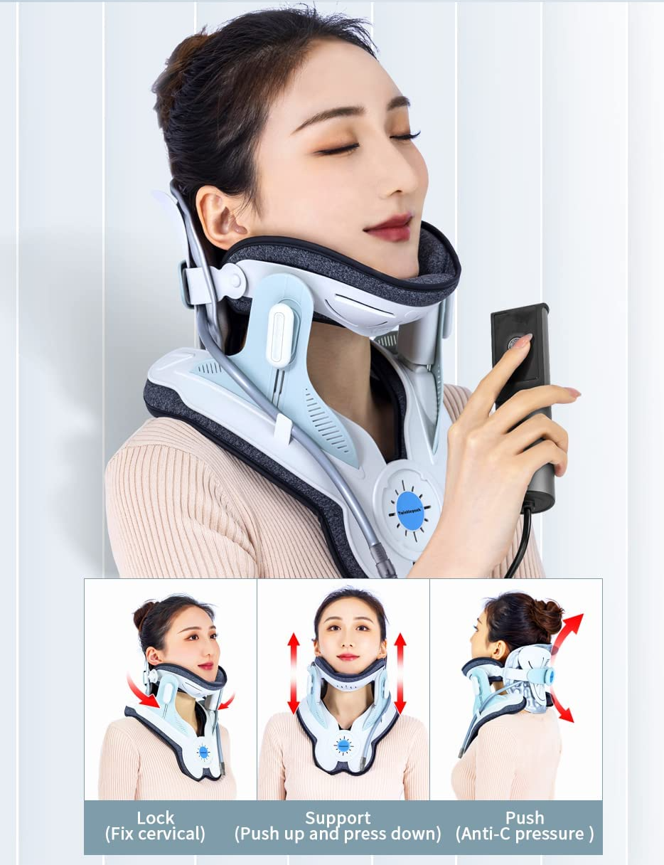 The cervical traction collar works by gently stretching the neck to alleviate pressure on the vertebrae, thereby reducing pain associated with bulging discs and cervical muscle tension. The collar’s electric pump system allows users to adjust the level of traction with precision, providing a customized therapeutic experience. It helps open up the spaces where nerves exit the spinal canal, relieving nerve compression and allowing healing nutrients to flow more effectively into the affected areas.