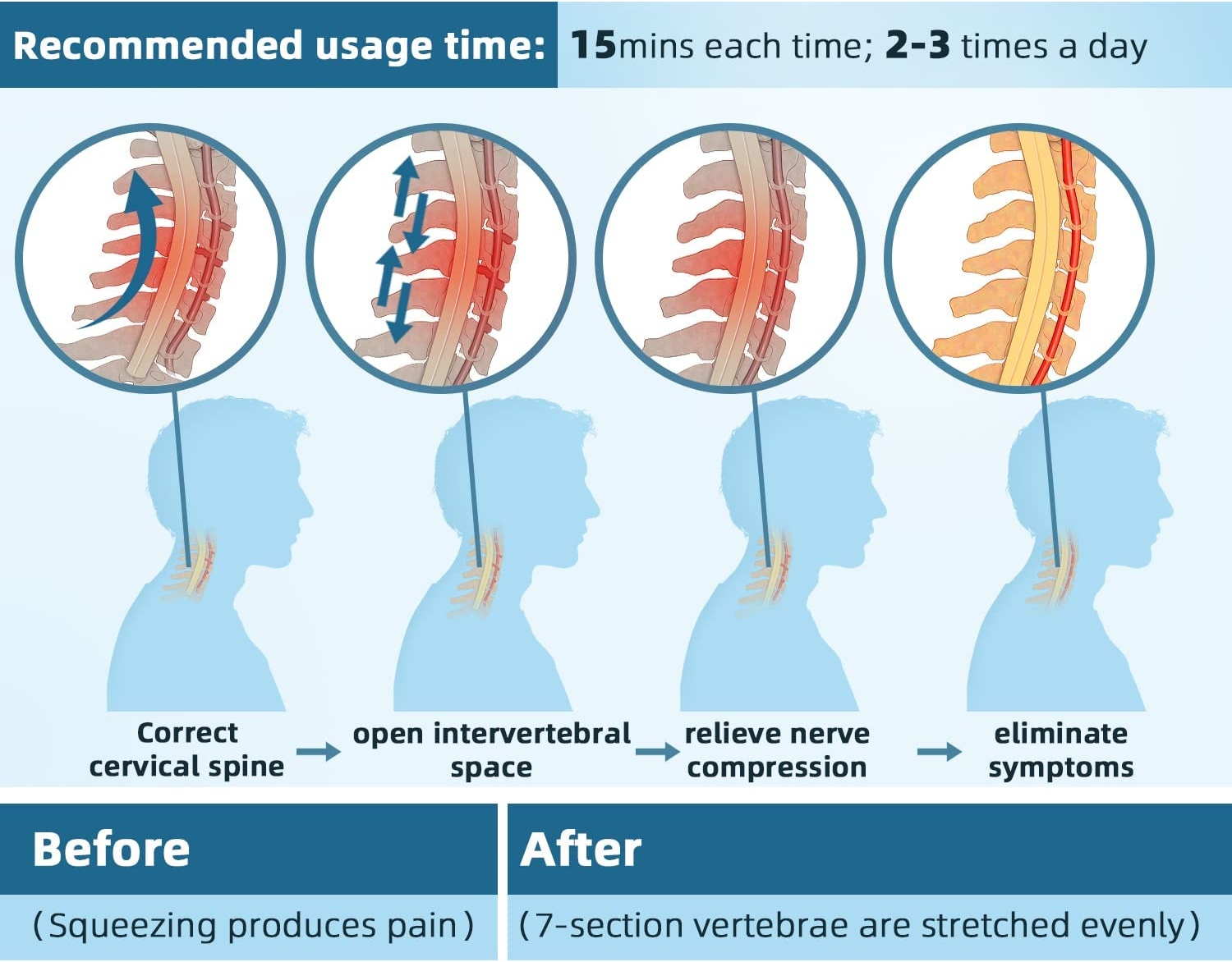 ✔ Designed to adjust the neck to the natural curve of 20° taking the pressure off the discs that reside between the vertebrae (Spinal Bones) results in almost immediate neck pain relief.