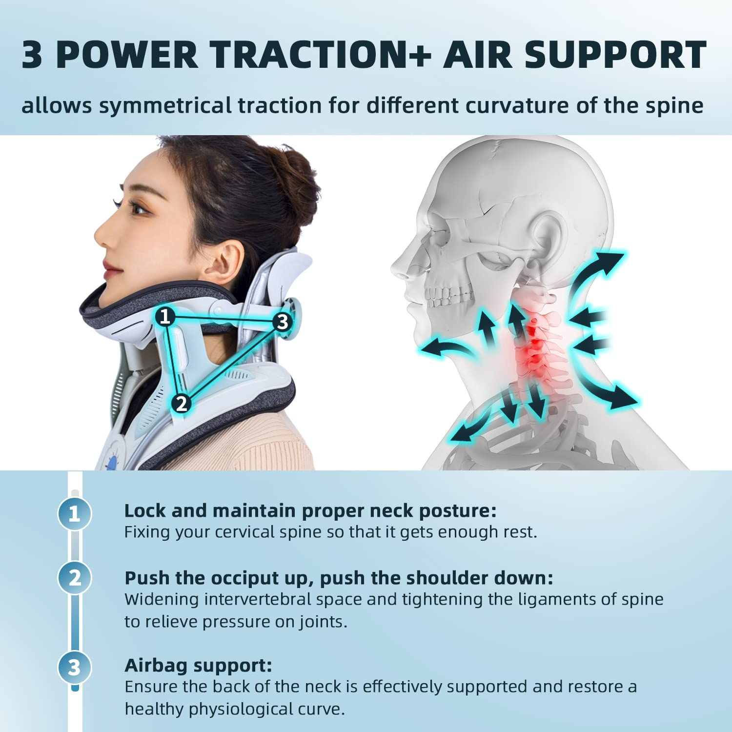 Cervitrax™ contains the pneumatic belt and one piece of the free-standing frame which provides a traction effect along the physiological curve through the up-down screws on L&R sides and inflated air bladder.