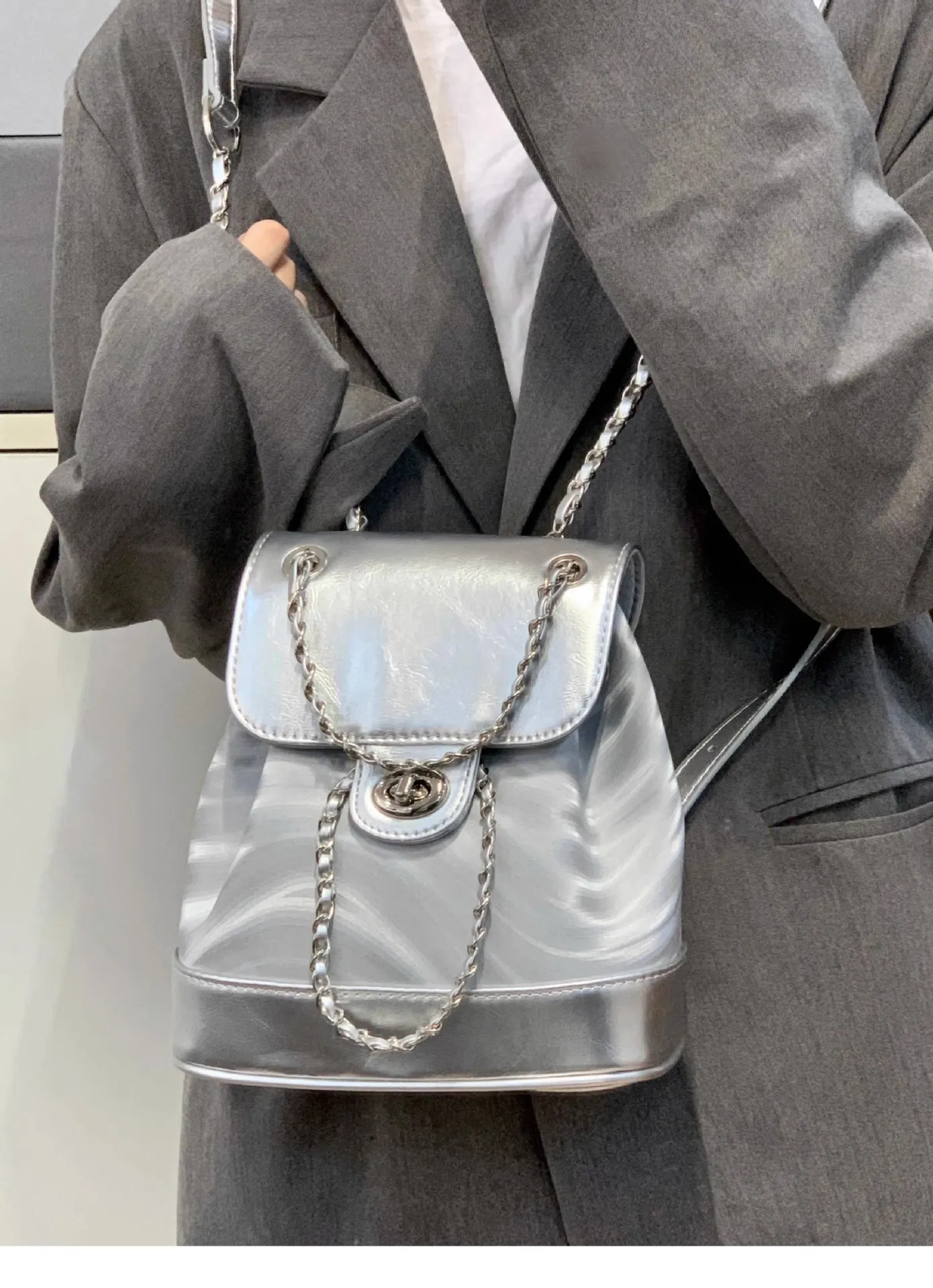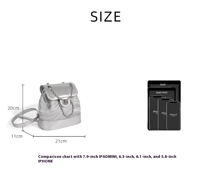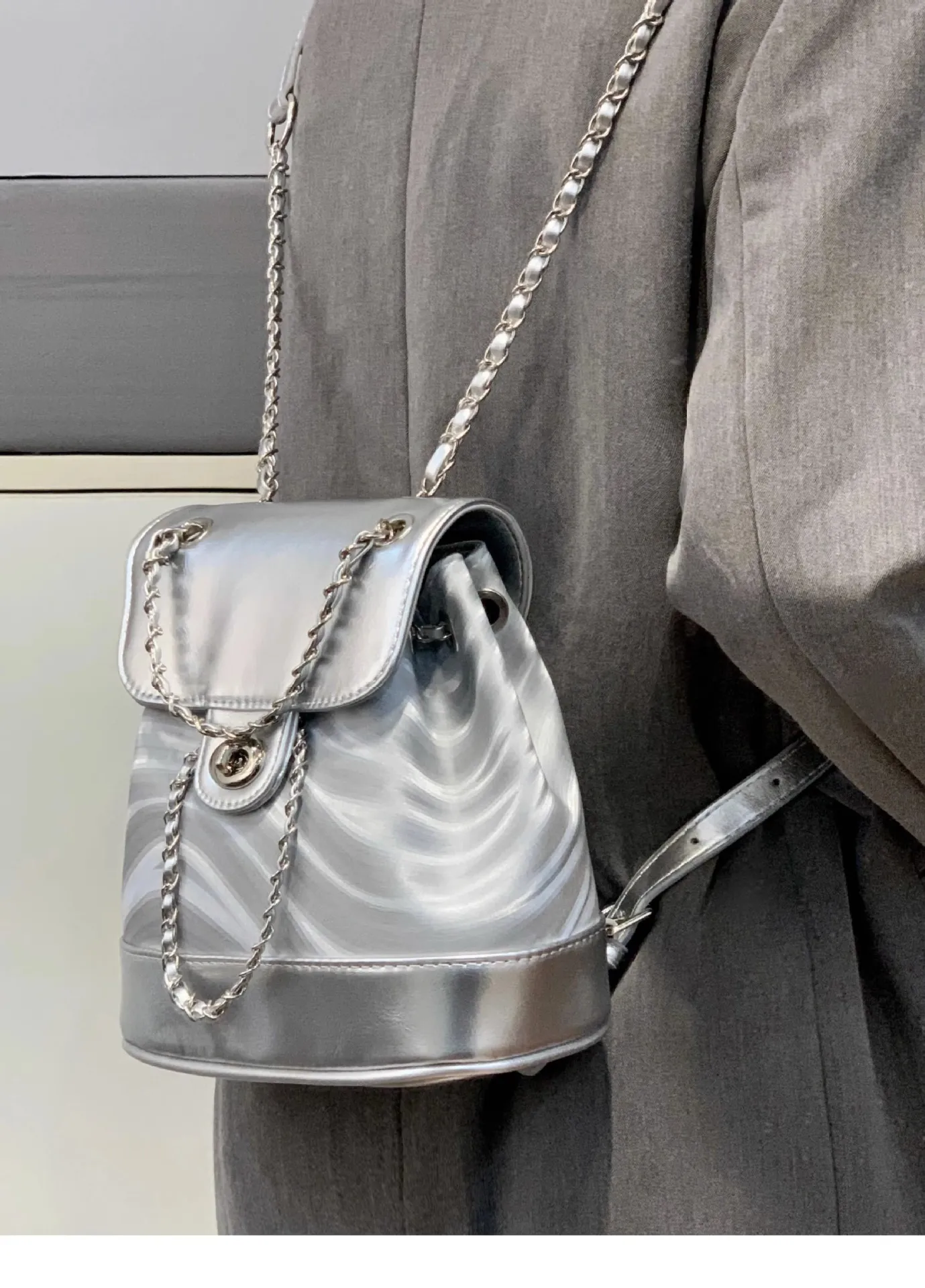 The Chain Backpack Women's Water Ripple Fashion Travel Backpack Bags is a chic and versatile accessory designed to meet the needs of contemporary women. Combining a sleek water ripple texture with a unique chain accent, this backpack is perfect for travel, daily commutes, or weekend outings. Its spacious design and fashionable details make it a must-have for those who value both style and functionality.