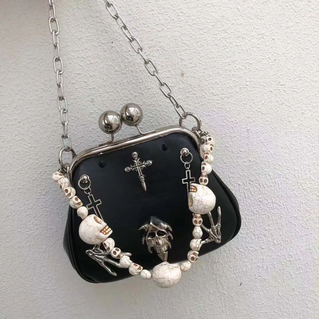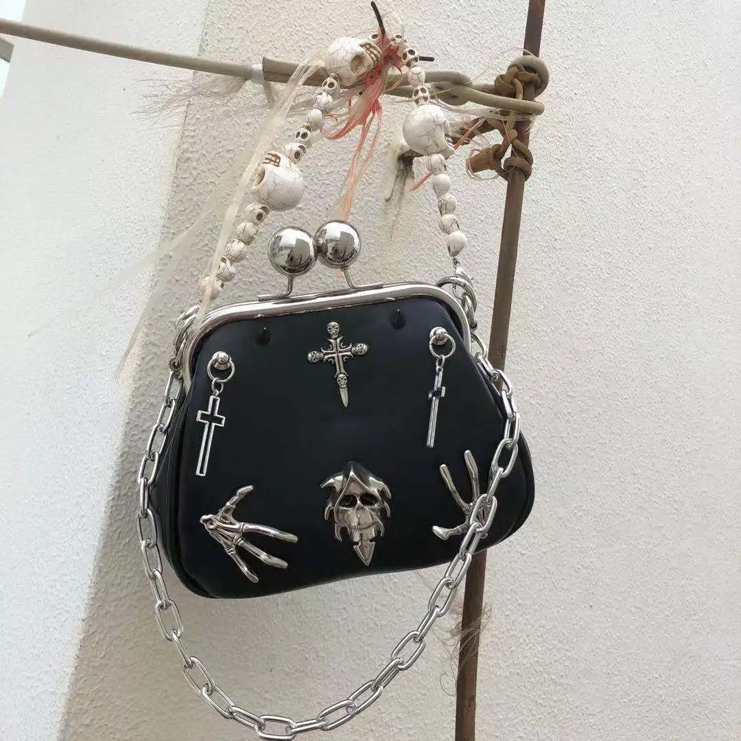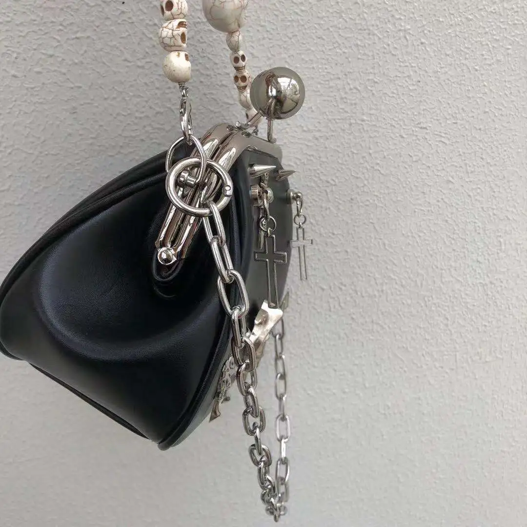 The edgy chain detailing and metallic accents make this bag a bold accessory that complements any punk-inspired or alternative outfit.