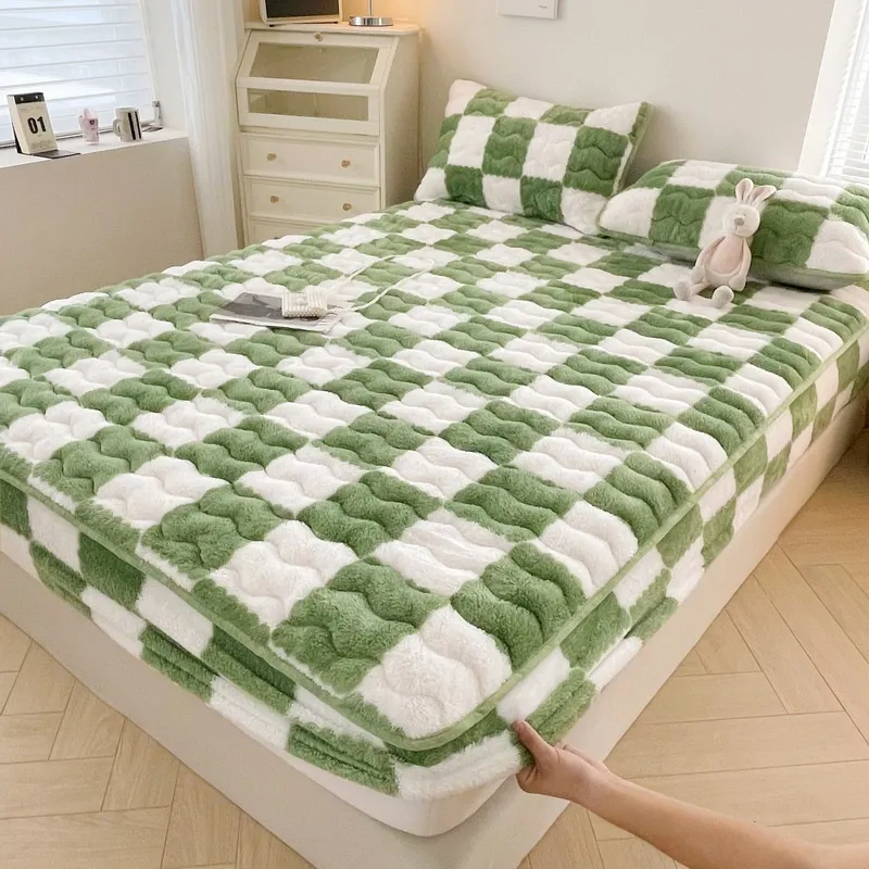 Checkerboard Warm Plush Mattress Cover – Cozy Insulated Comfort with Stylish Texture