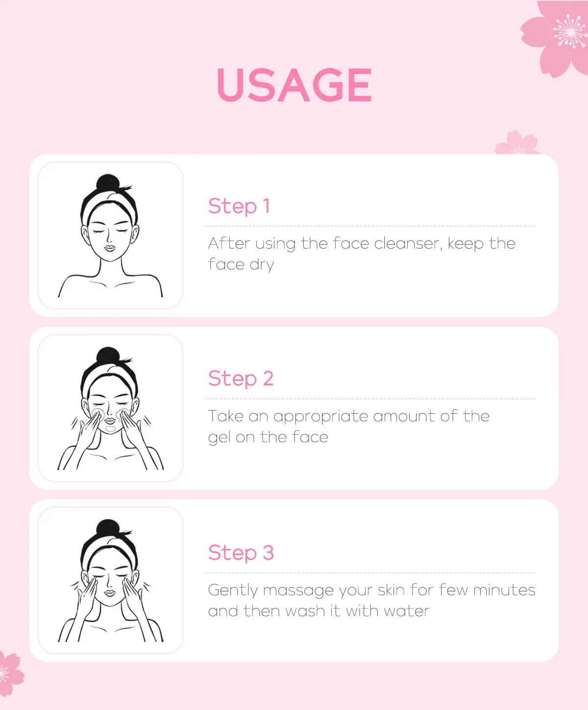 Take a small amount of the Cherry Blossom Exfoliating Gel and apply it to your face or body. Gently massage the gel into your skin using circular motions for 1–2 minutes, focusing on rough or dry areas.