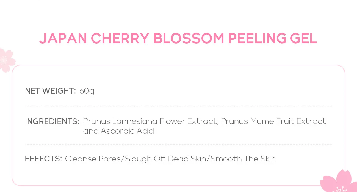 moisturize your skin. Infused with the soothing essence of Cherry Blossom, this exfoliating gel helps to remove dead skin