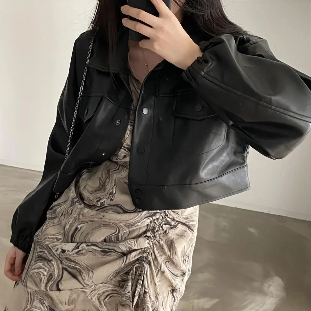 Chic Lapel Double Pocket Leather Top Leather Coat